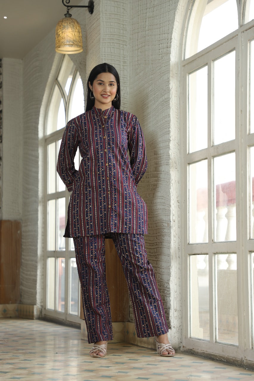 Bring heritage to your wardrobe with our Ajrakh-Inspired Co-Ord Set, a celebration of traditional craft fused with contemporary styling. Crafted in breathable cotton, this two-piece ensemble features a rich palette of deep indigo, maroon, and ivory in a vertically striped Ajrakh print that elongates your silhouette and elevates your everyday look.