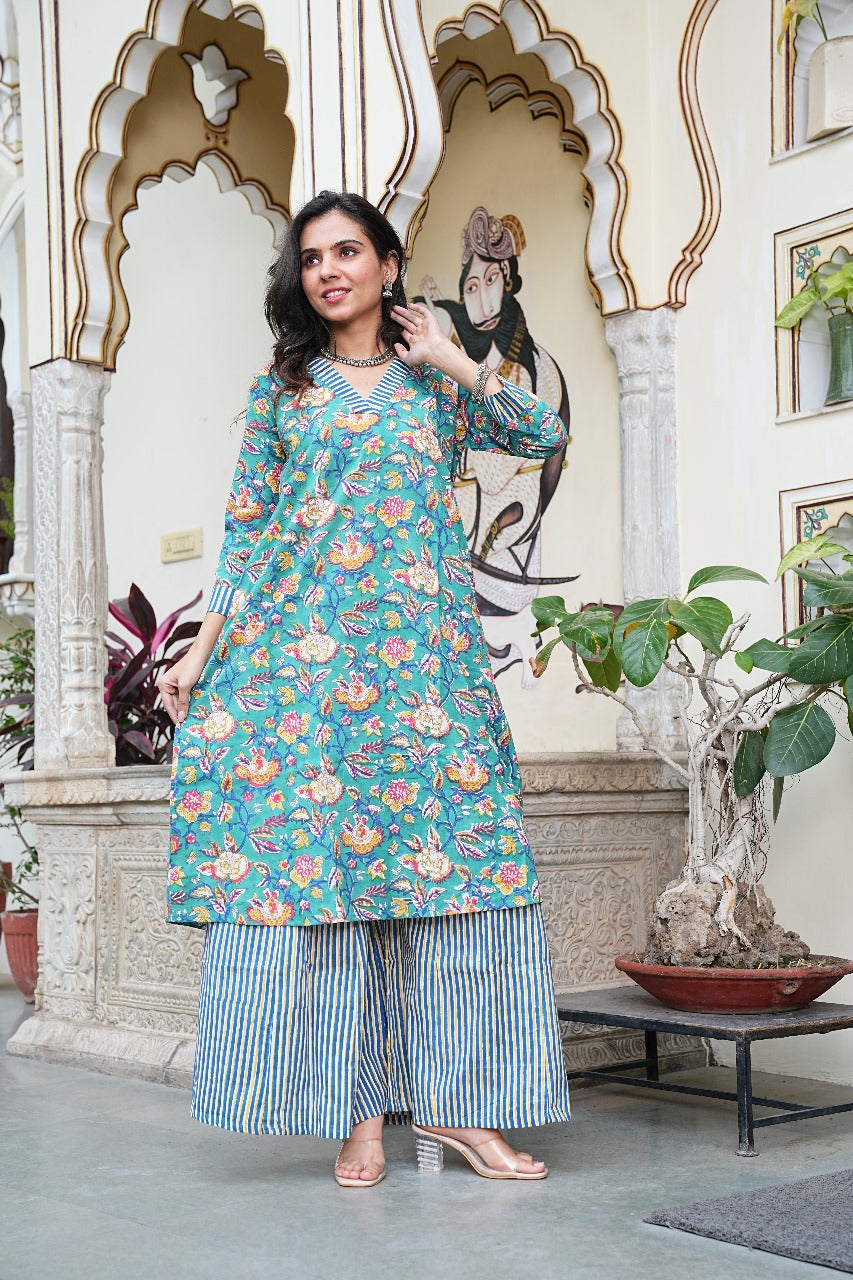 Fresh, floral, and full of flair – this Aqua Blossom Kurta Set is a delightful addition to your wardrobe. Featuring a vibrant floral print on a turquoise base and paired with smart striped palazzos, this set strikes the perfect balance between tradition and contemporary charm.