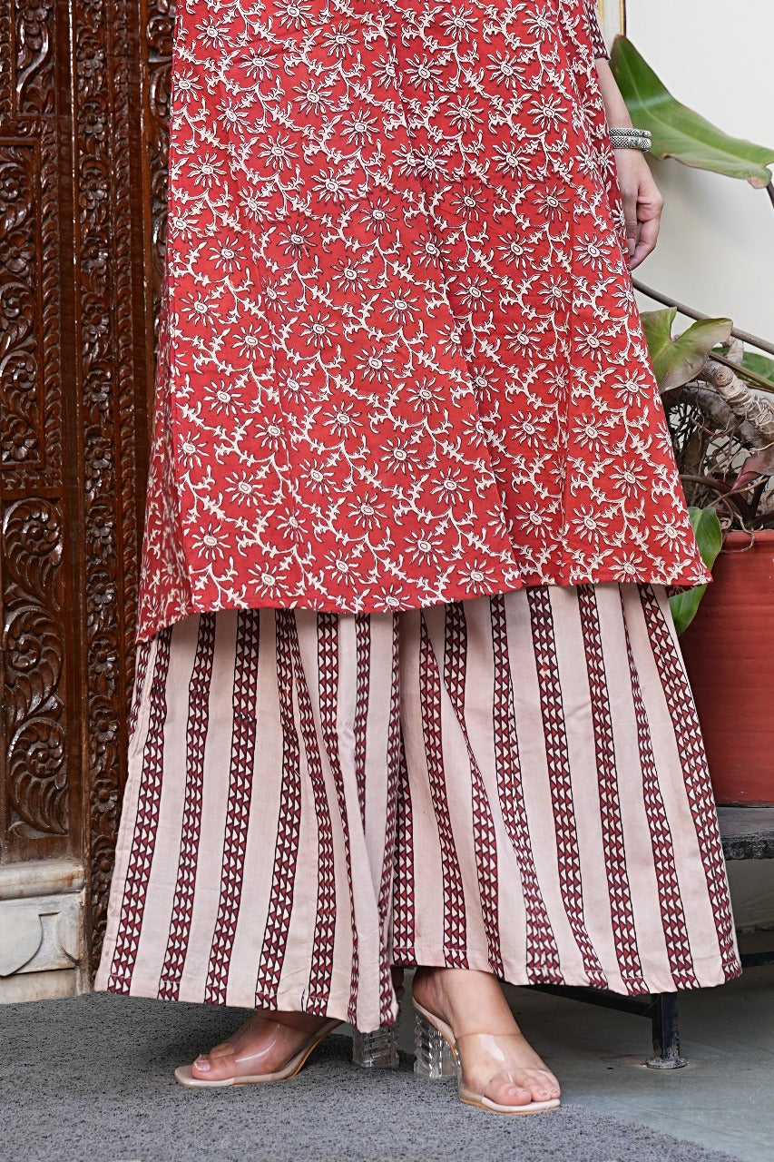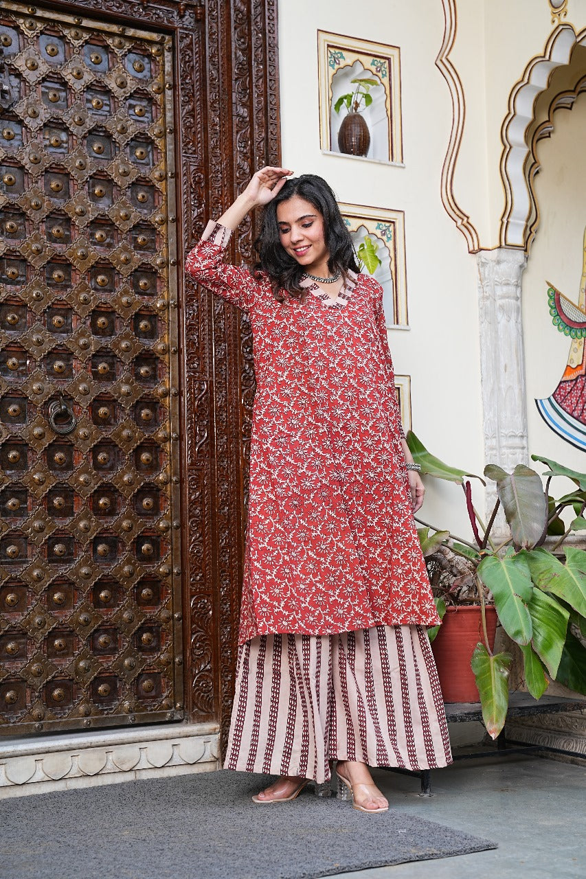 Step into timeless grace with our Bagru block printed kurta Set where deep earthy tones meet folk-inspired floral artistry. The kurta, adorned with dainty off-white blooms, exudes understated charm, while the striking striped palazzos add a bold, contrasting rhythm — creating a look that’s as rooted as it is refreshing.