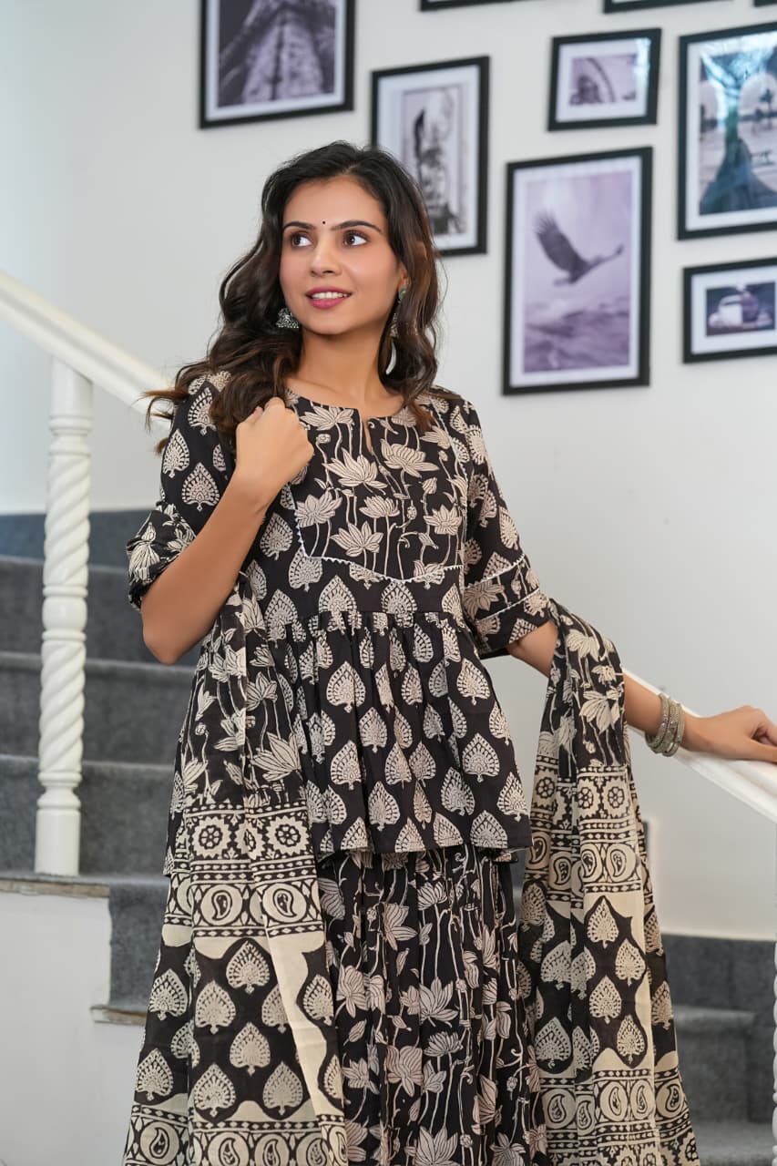 Grace meets tradition in this Black Bagru Handblock Printed Lehenga Set, a stunning ode to handcrafted artistry. Featuring a palette of charcoal black and natural cream, this ensemble captures the timeless beauty of block printing with motifs inspired by nature.