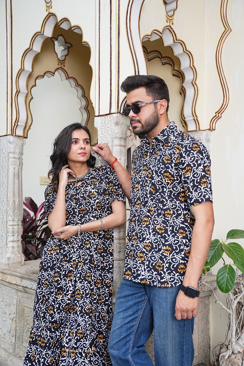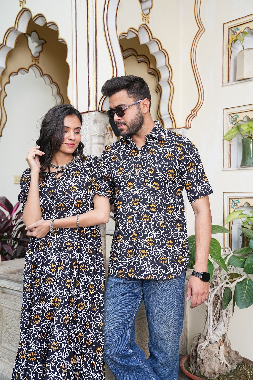 Step into effortless elegance with the BLACK & MUSTARD COUPLE SET , featuring bold floral impressions on deep midnight hues. Ideal for date nights, ethnic Fridays, or festive family functions, this set blends traditional Indian block printing with a chic, modern palette.