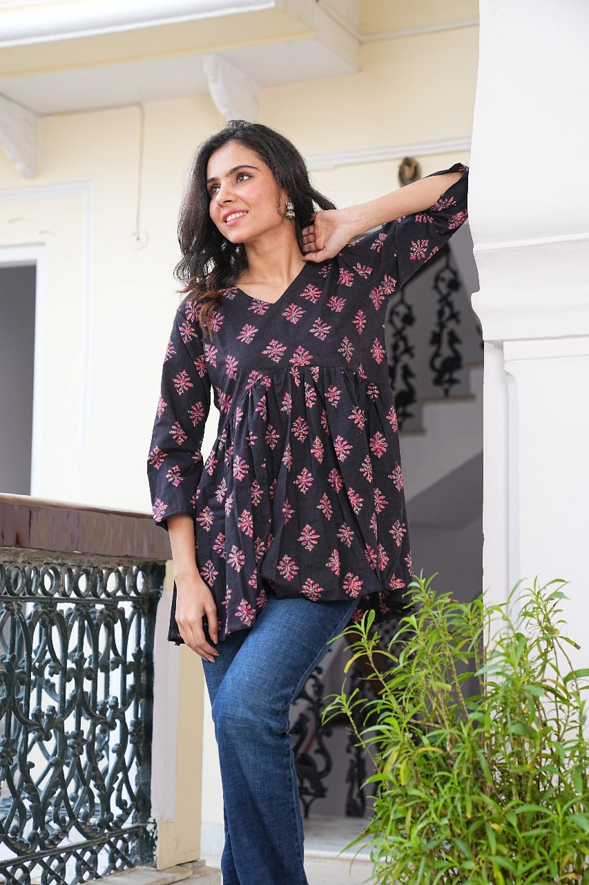 Elevate your everyday look with our Black & Rose Hand Block Printed Cotton Tunic. Crafted in soft breathable cotton, this relaxed-fit tunic features intricate pink floral motifs hand-block printed on a deep black base. Perfectly tailored for elegance and comfort, it's your go-to for both casual charm and bohemian flair.