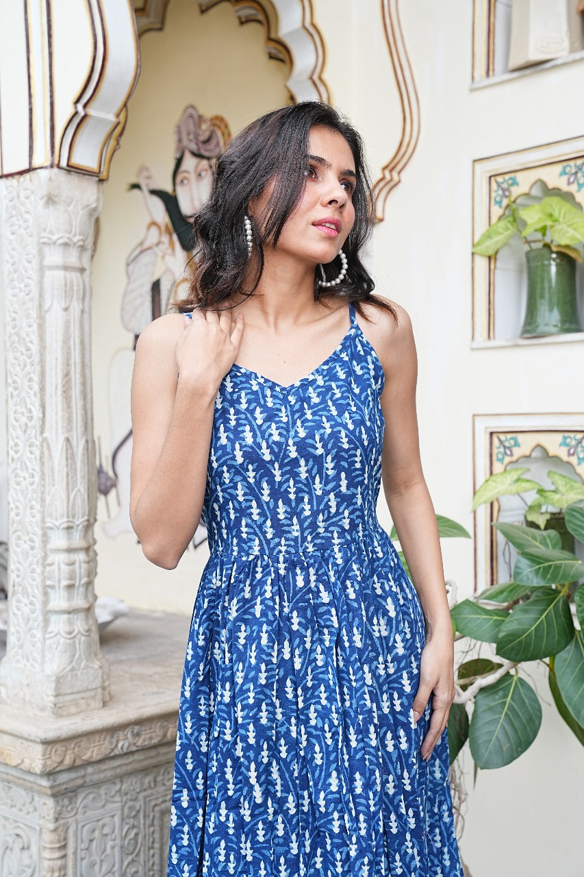 Feel effortlessly beautiful in our Blue Bloom Handblock Cotton Long Dress, a timeless piece that combines artisanal charm with breezy elegance. Crafted in soft, breathable cotton and handblock-printed in fresh white botanical motifs on a vibrant blue base, this dress is your perfect companion for sunlit days and festive evenings.
