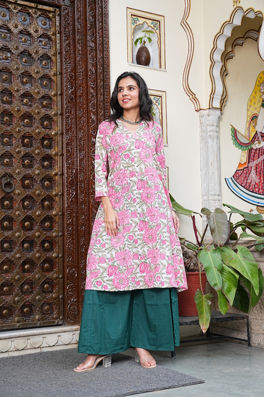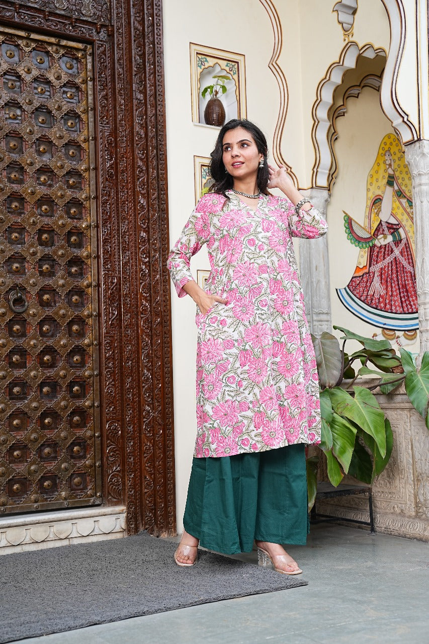 Step into sunshine with our Blush Bloom Kurta Set, a refreshing medley of color and comfort. Adorned with oversized floral prints in radiant pinks, this kurta is your go-to for daytime elegance. The deep green palazzos provide the perfect grounding contrast, bringing out the print’s vibrance even more.