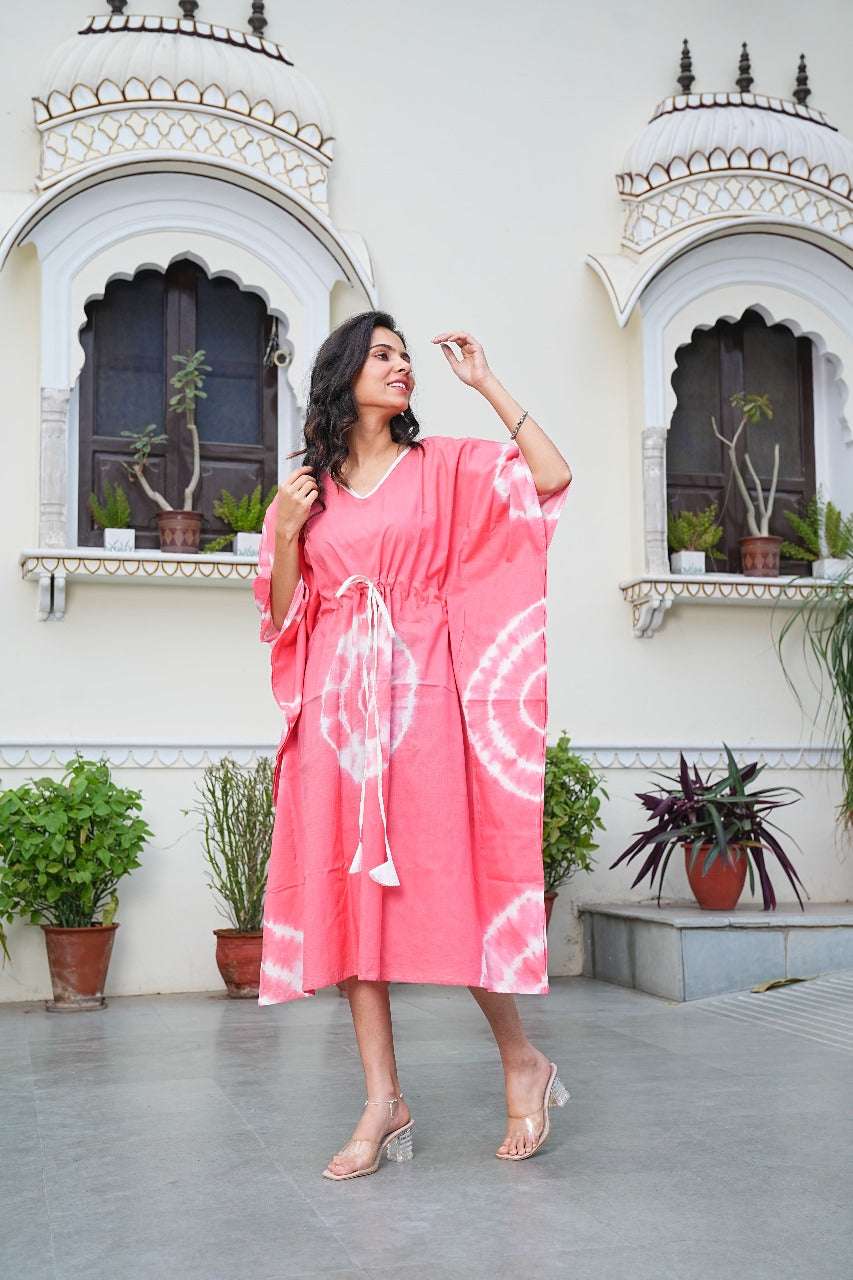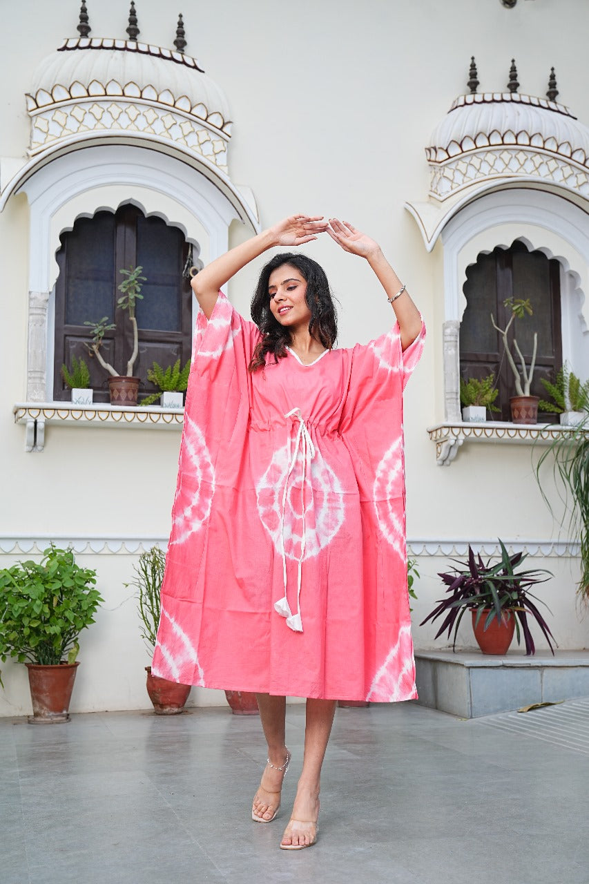 Add a burst of brightness to your wardrobe with our Blush Pink Shibori Tie-Dye Cotton Kaftan. Handcrafted with care, this piece channels free-spirited charm through bold tie-dye patterns and a relaxed, versatile silhouette.
