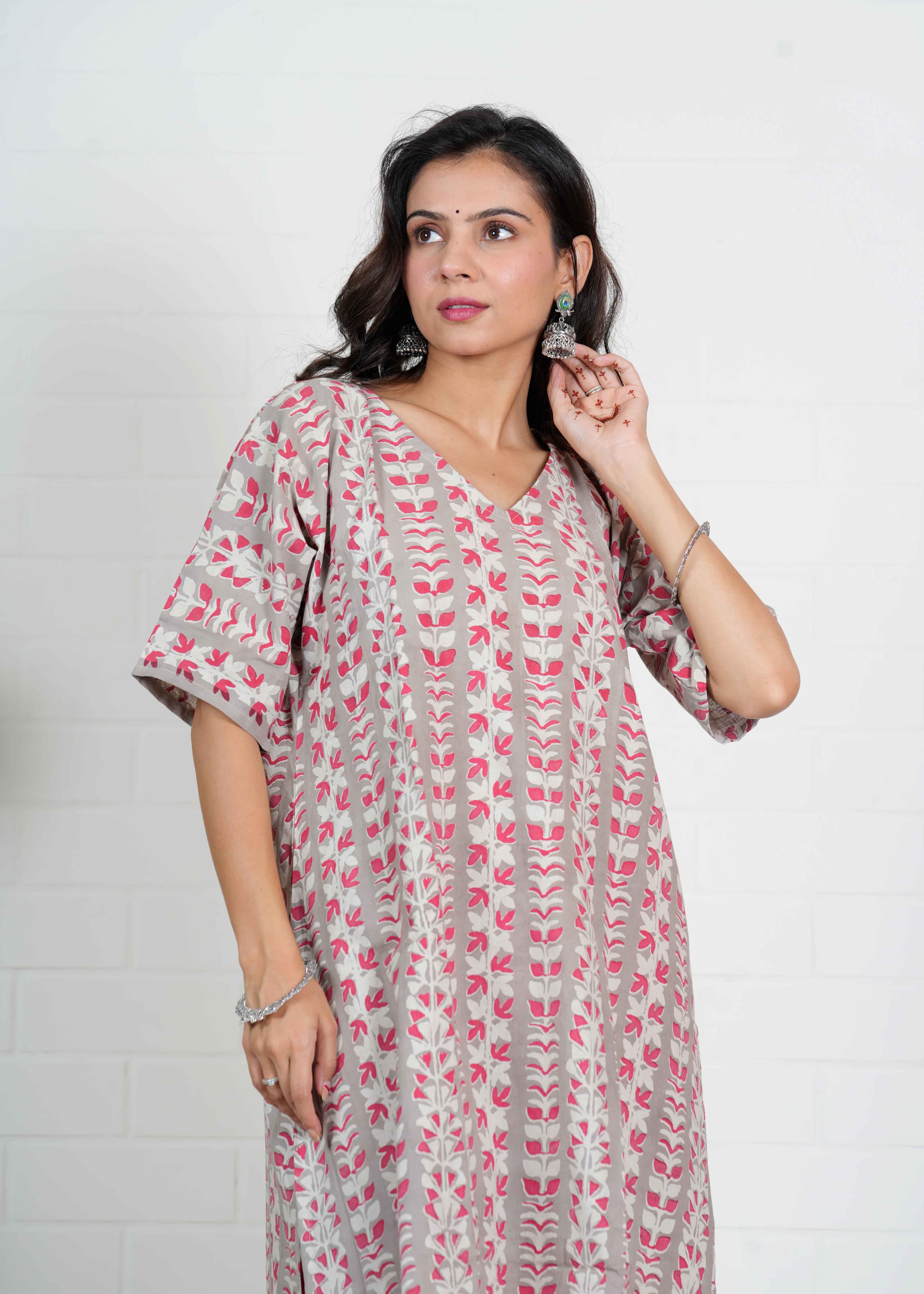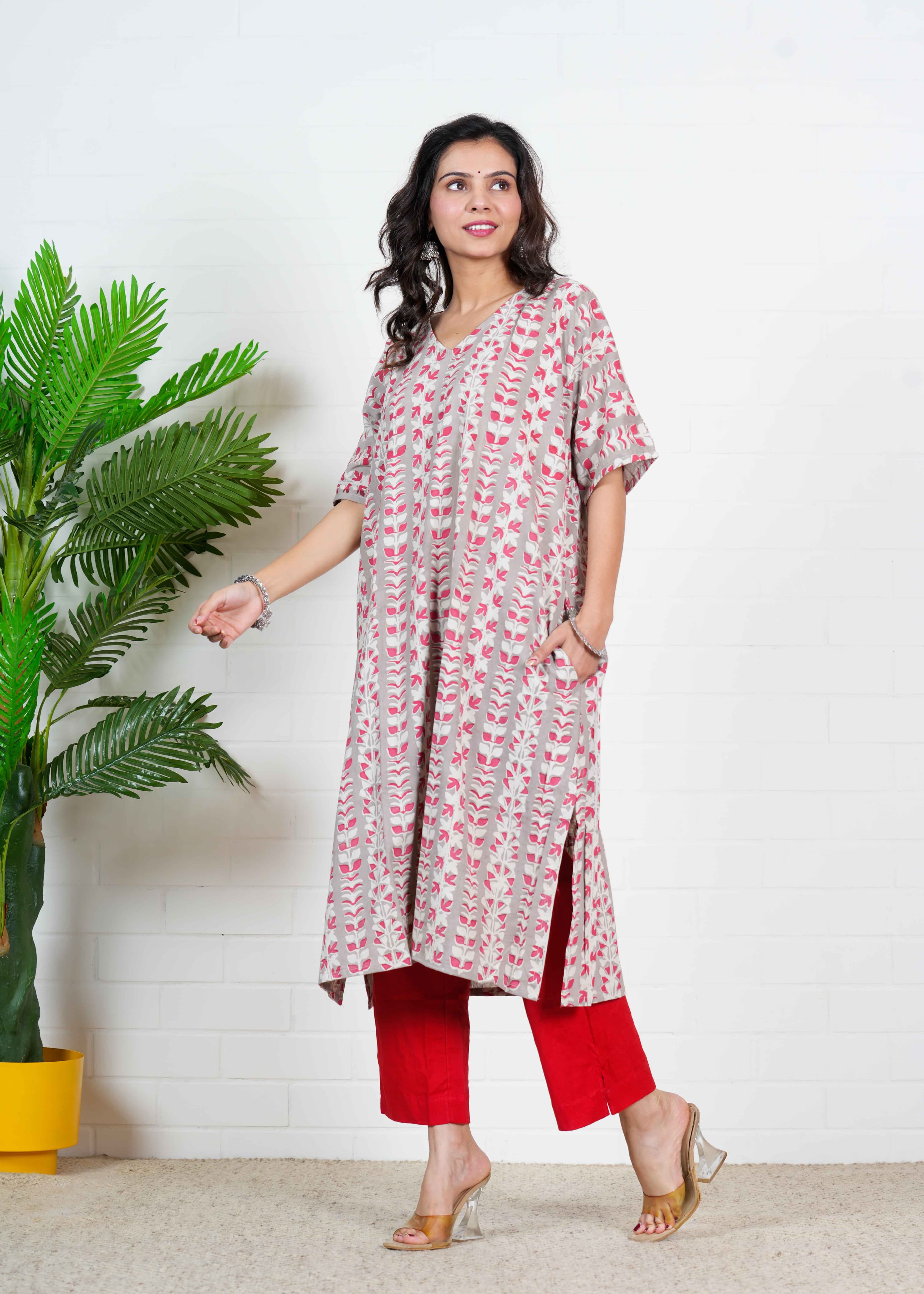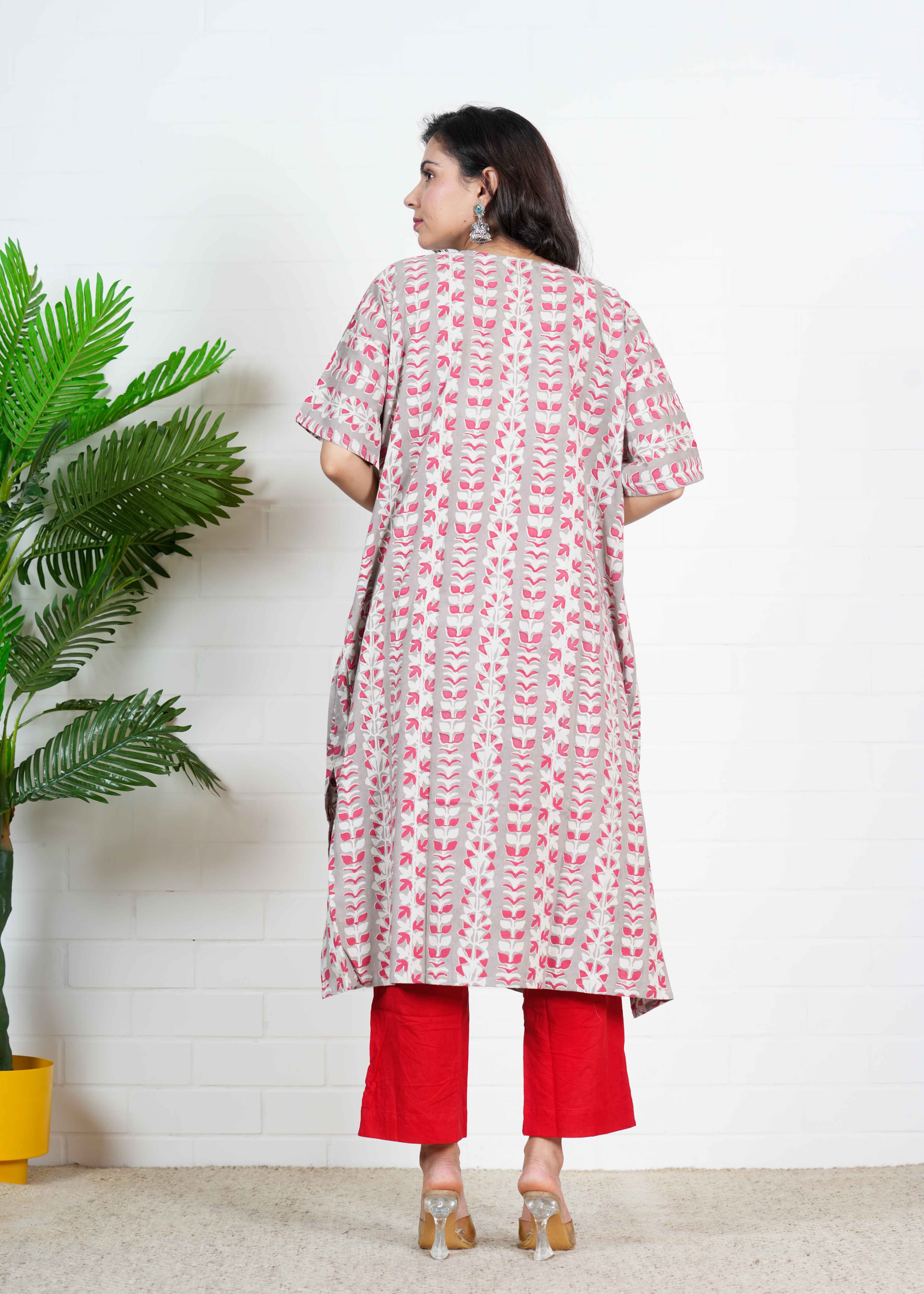 Step into a world of calm elegance with Chandni Bel, an oversized kurti set that brings nature's rhythm into your wardrobe. The soothing beige-grey base is adorned with vertical floral vine patterns in rose pink and off-white—each motif thoughtfully hand block printed by master artisans. Paired with striking red cotton pants, this ensemble strikes the perfect harmony between traditional craftsmanship and relaxed contemporary fashion.