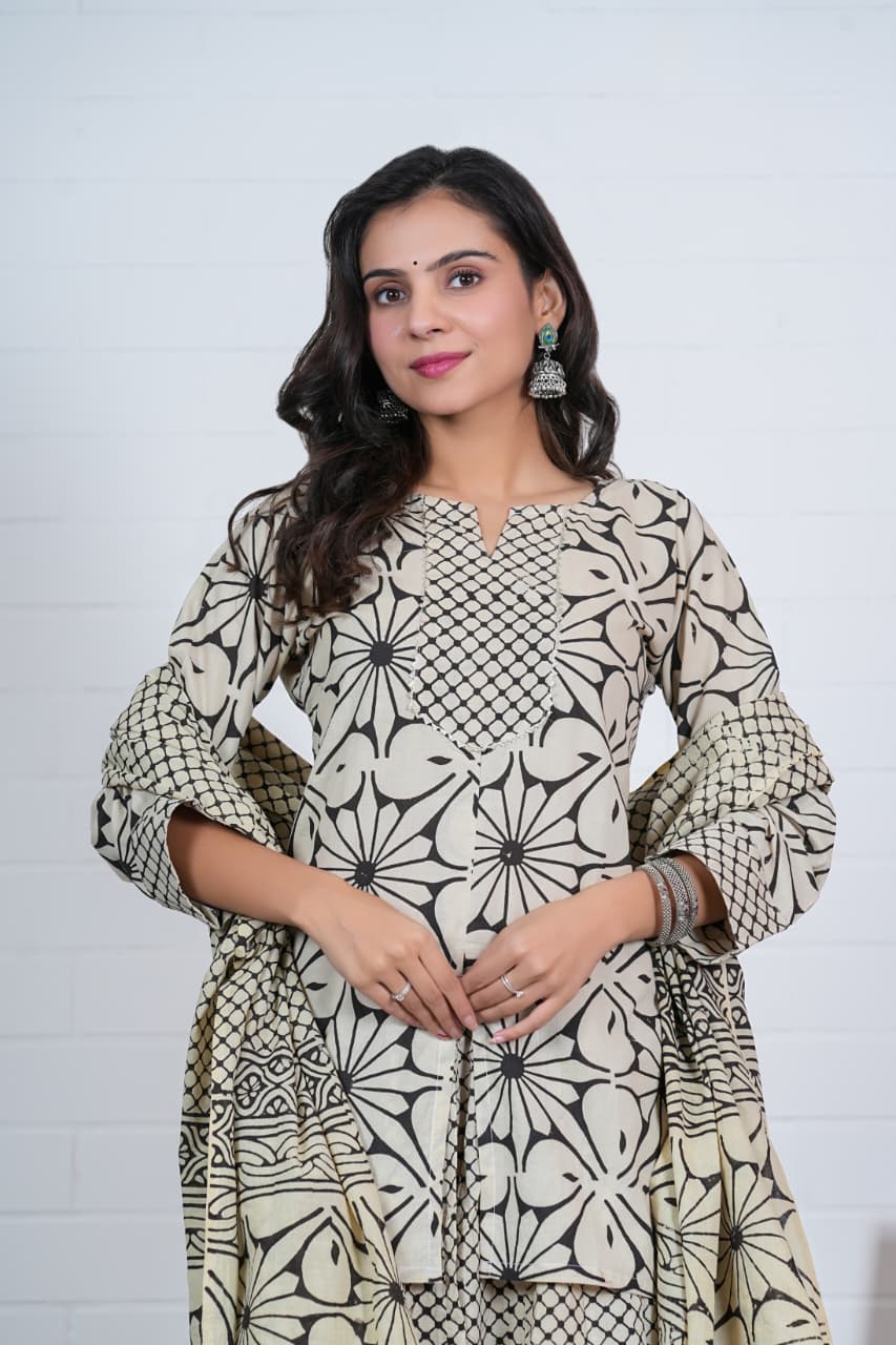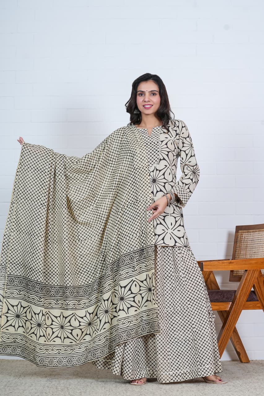 Step into the world of contemporary elegance with the Cream & Black Hand Block Printed Lehenga Set. A harmonious blend of black and white, this set showcases traditional block prints in a modern design. The kurta-style blouse features a mix of geometric and floral block patterns, paired with a flared lehenga skirt for a graceful, flowing look. A matching black and white dupatta adds the final touch of charm, making it a perfect ensemble for a chic, festive affair or a stylish evening out.