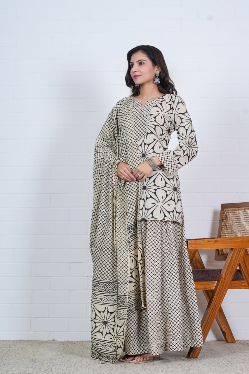 Lehenga & Kurta Top: Black and white with intricate geometric and floral block prints
