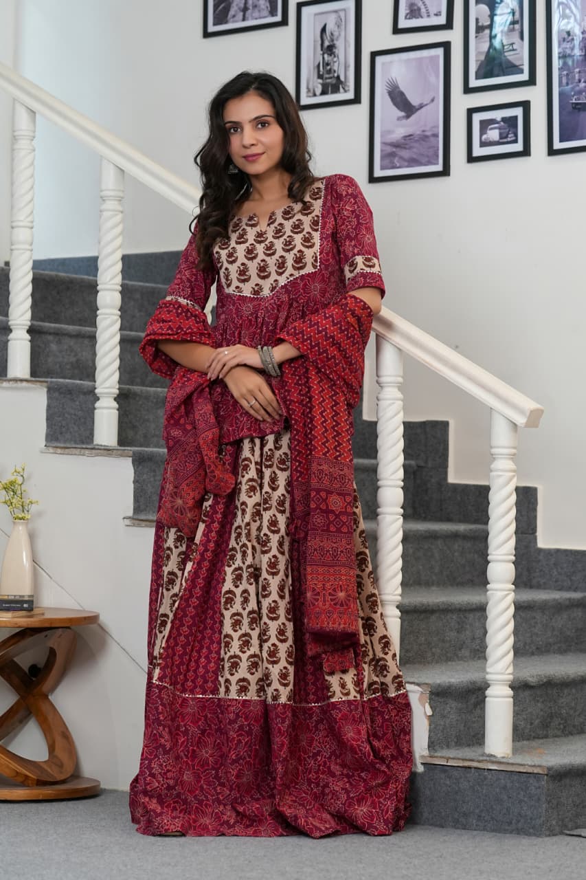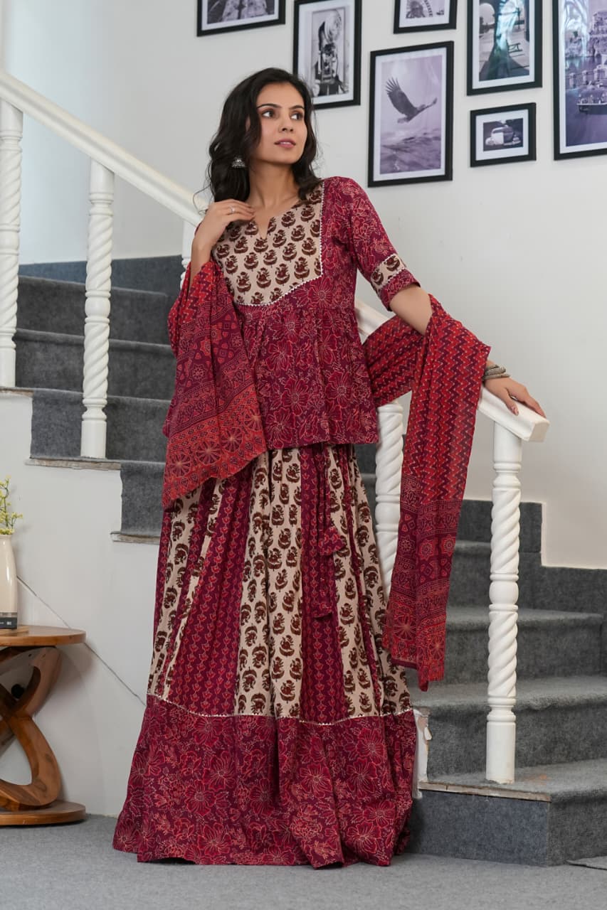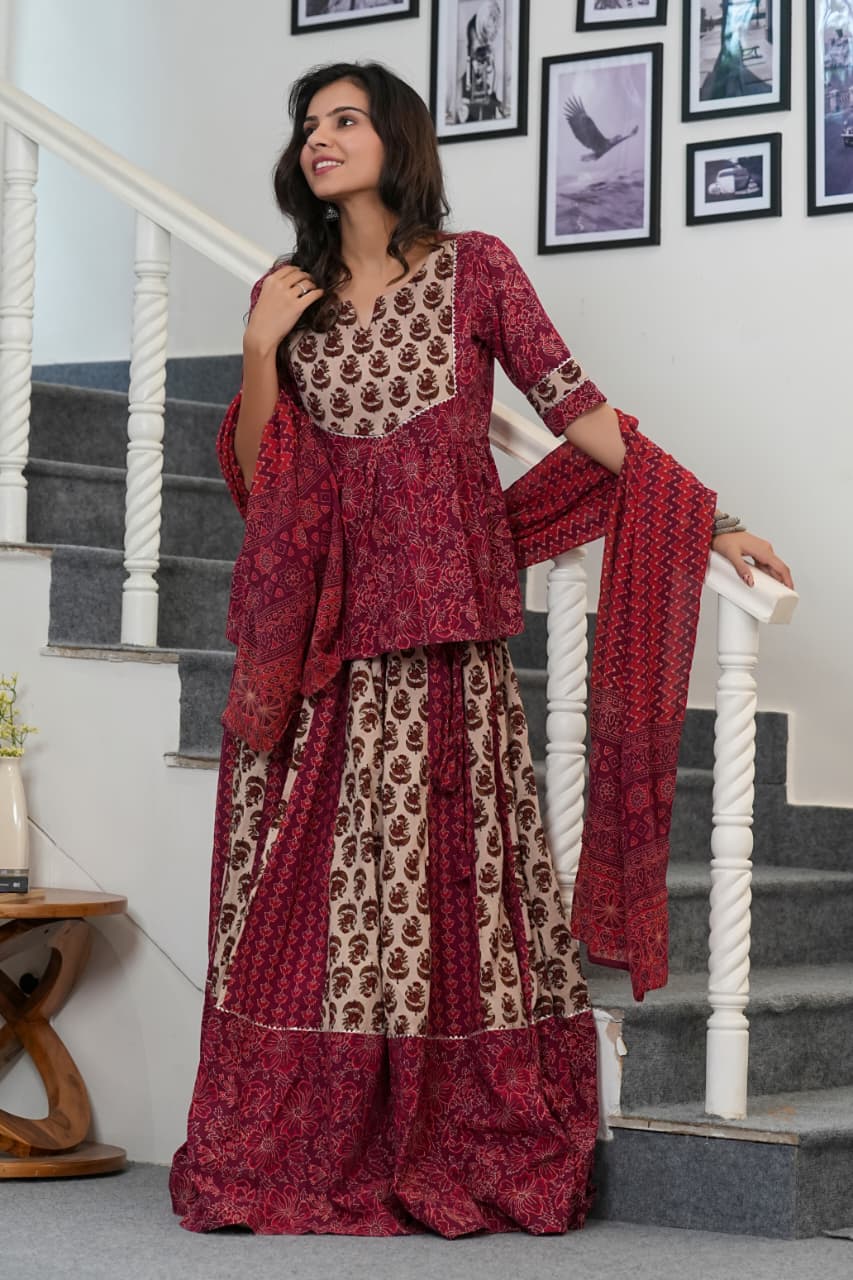 An ensemble that radiates warmth & festive elegance – the DEEP MAROON - RUST RED & BEIGE HANDBLOCK LEHENGA SET is a celebration of traditional block printing in earthy tones. The contrast of deep maroon and beige florals creates a perfect harmony of boldness and grace. Crafted in pure breathable cotton, it ensures comfort without compromising on regal charm.