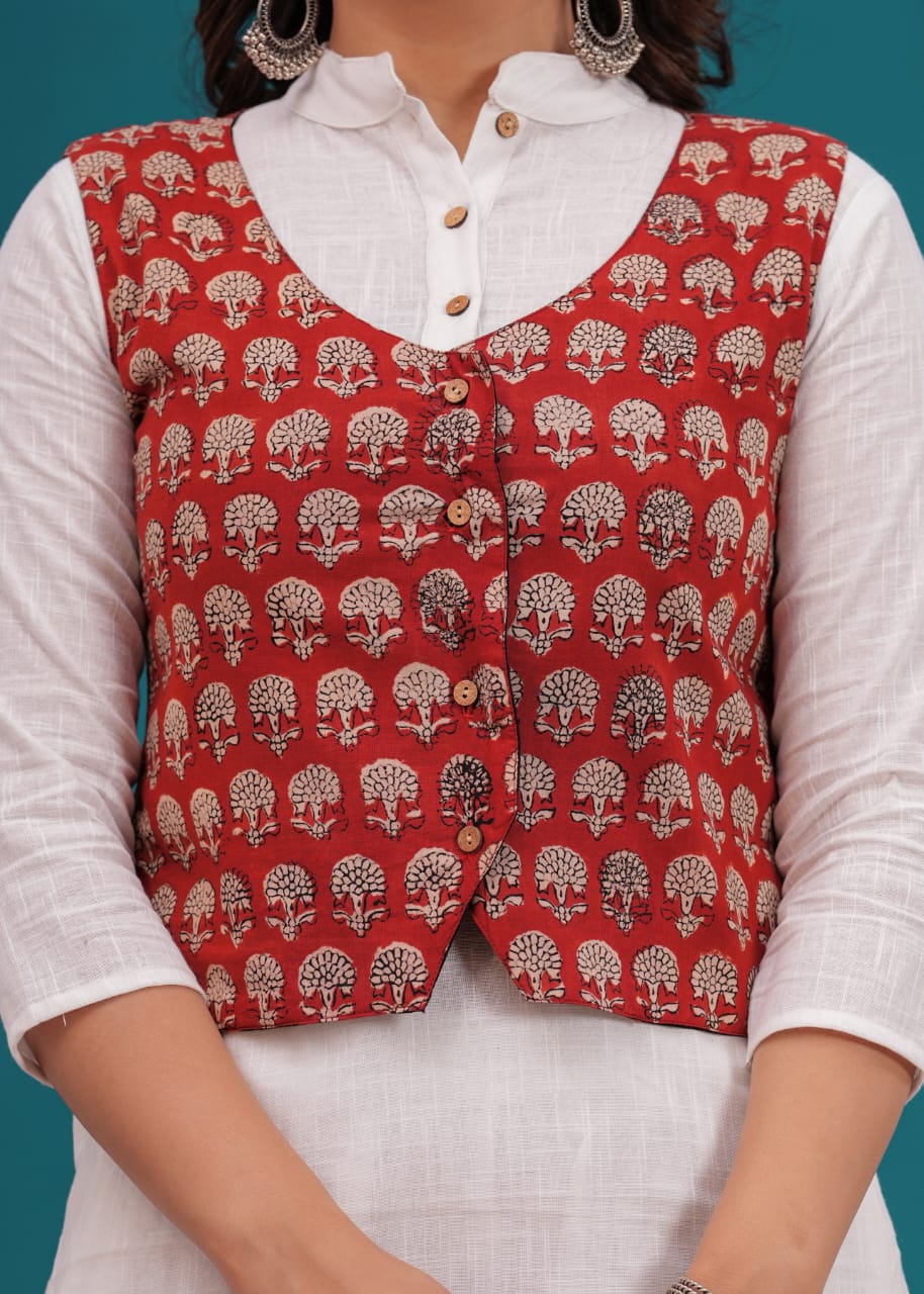 Simplicity finds its perfect muse in “Gul-E-Safed,” a serene ensemble that captures the essence of understated grace. Crafted in soft white cotton slub, this kurti and pant set is beautifully elevated with a rust-red hand block printed jacket, featuring delicate motifs inspired by blooming trees.