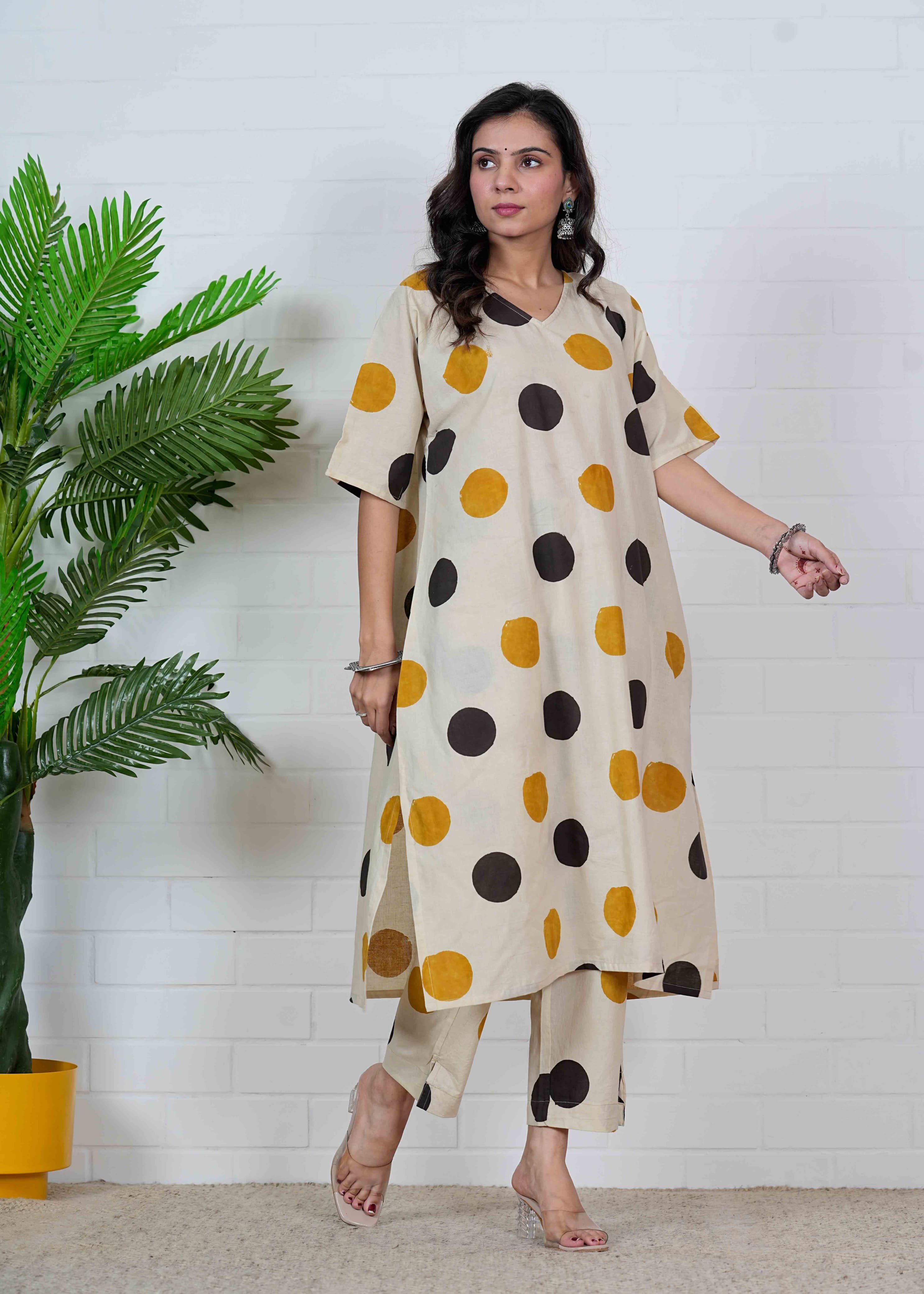 Add a splash of quirk to your everyday elegance with the Gulabo Bindi set — a charming nod to retro style with a modern twist. Crafted in breathable beige cotton, this oversized kurti features hand block printed polka dots in earthy mustard yellow and charcoal black, paired perfectly with coordinated pants. An effortlessly fun outfit that balances comfort with creativity.