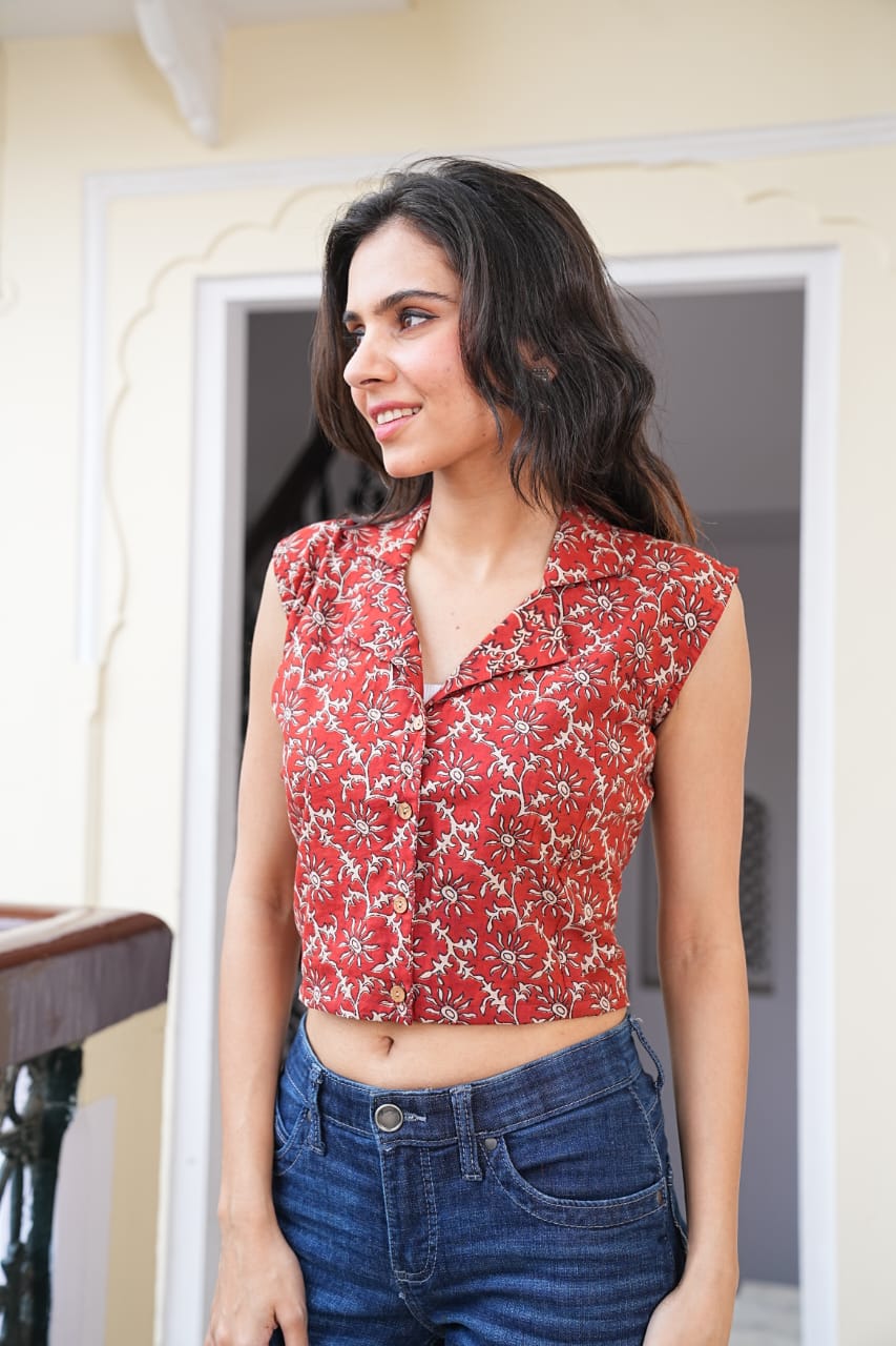 Inspired by the blooming gulmohar tree under a summer sun, Gulmor Rang is a vibrant ode to nature’s fiery hues. This rust-red crop top, handcrafted in breathable 100% cotton, features blooming off-white floral block prints with a delicate green vine pattern—giving it a raw, rooted charm.