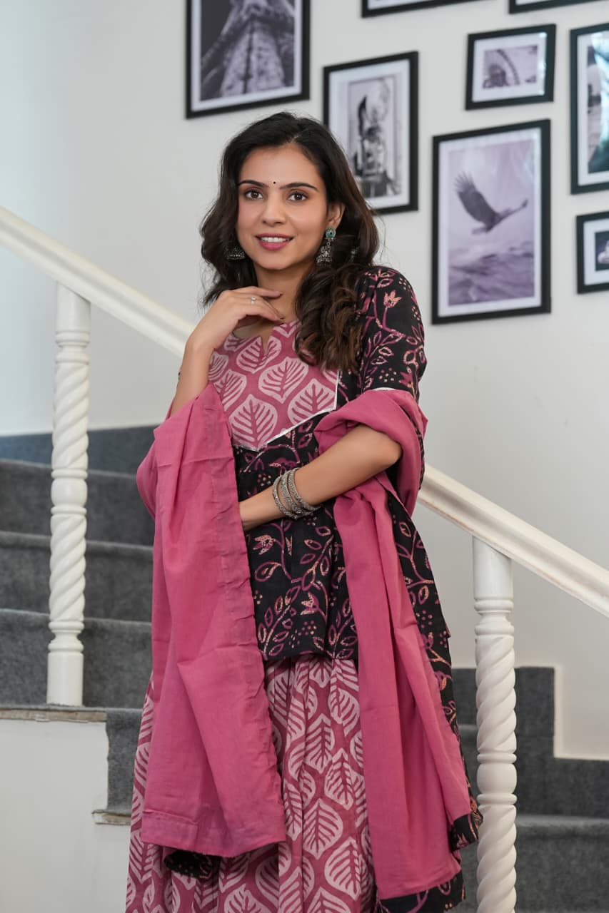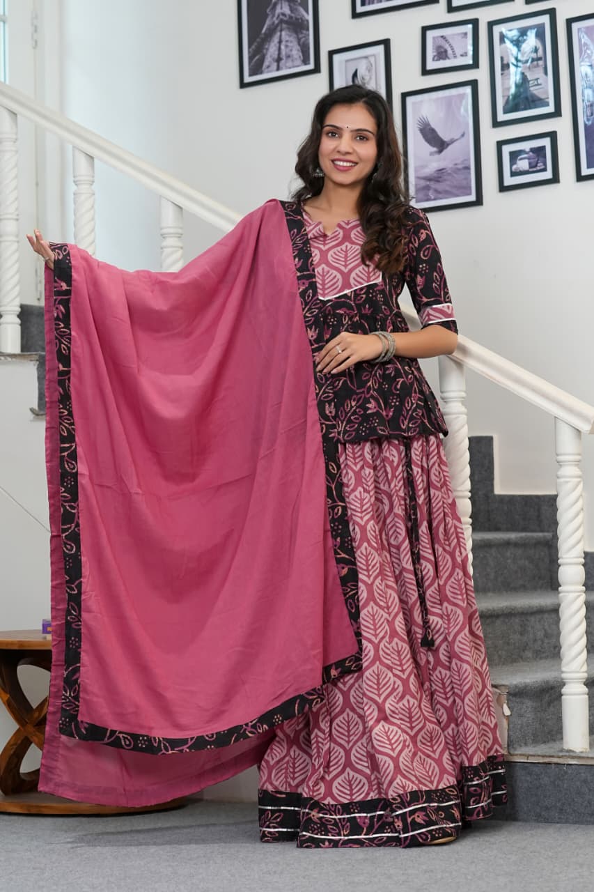 Graceful, chic and rooted in tradition – the Gulnar Handblock Rose Pink & Black Lehenga Set is crafted for the woman who loves to blend elegance with ease. Its rose-pink leaf motifs balanced with a contrasting black peplum kurti create a striking fusion of colors and patterns. The soft cotton fabric ensures comfort, while the flowing lehenga and plain dupatta complete the look.