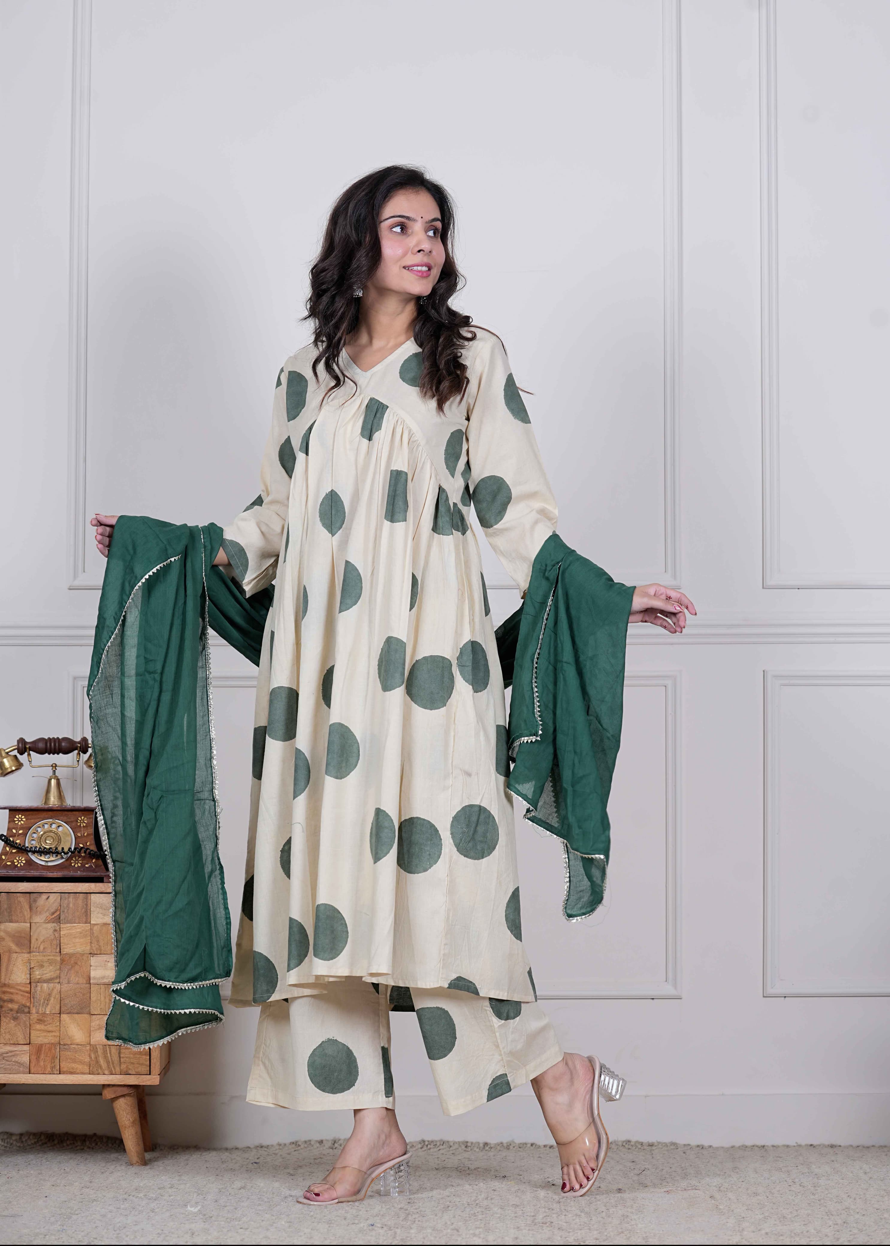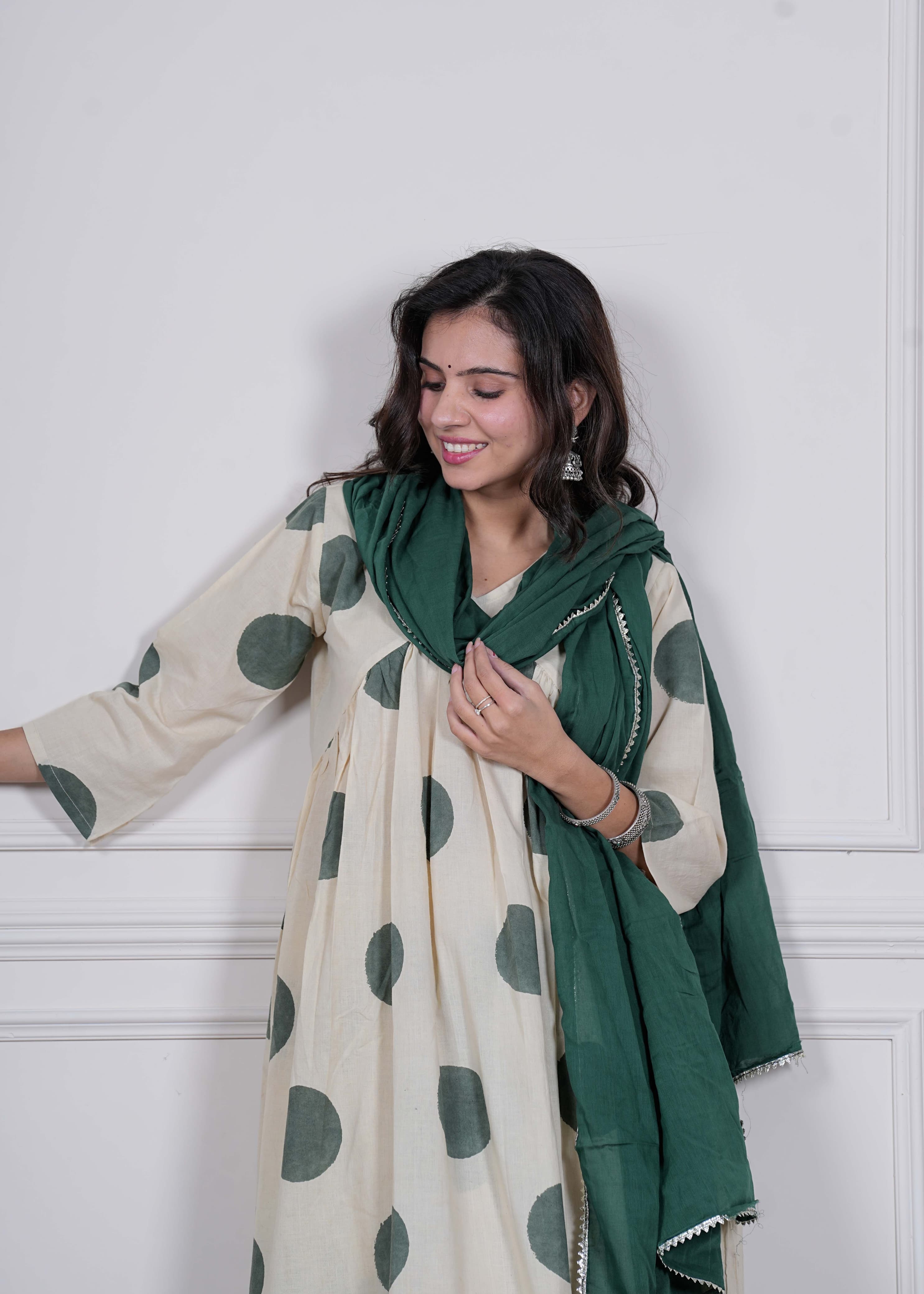 Make a statement in subtlety with Gulzar Bindu, a beautifully hand block printed 3-piece cotton set that speaks the language of earthy elegance. The kurta and pants feature bold, playful forest green polka dots printed on a soft natural off-white base, exuding both minimal charm and cultural richness. Paired with a solid green dupatta with delicate lace detailing, this set is your go-to for intimate gatherings, cultural celebrations, or breezy festive days.