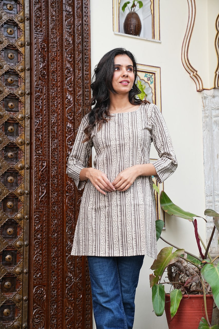 Elevate your everyday style with our HANDCRAFTED BEIGE & BROWN HAND PRINT SHORT KURTI, a perfect blend of ethnic elegance and modern comfort. Featuring an earthy beige base adorned with intricate brown Ikat-inspired patterns, this kurti is designed for the modern woman who appreciates timeless craftsmanship.