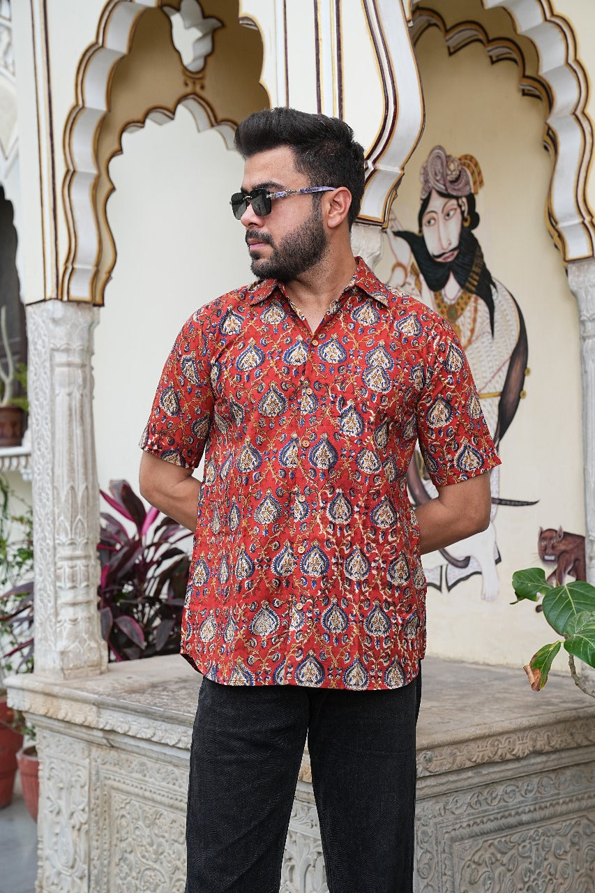 Step into timeless elegance with our Heritage Block Print Cotton Shirt in vibrant Royal Red. Inspired by the rich cultural motifs of Rajasthan, this shirt is a perfect blend of traditional artistry and contemporary style. Crafted with care from 100% premium cotton, it promises all-day comfort and breathability—ideal for both casual and semi-formal occasions.