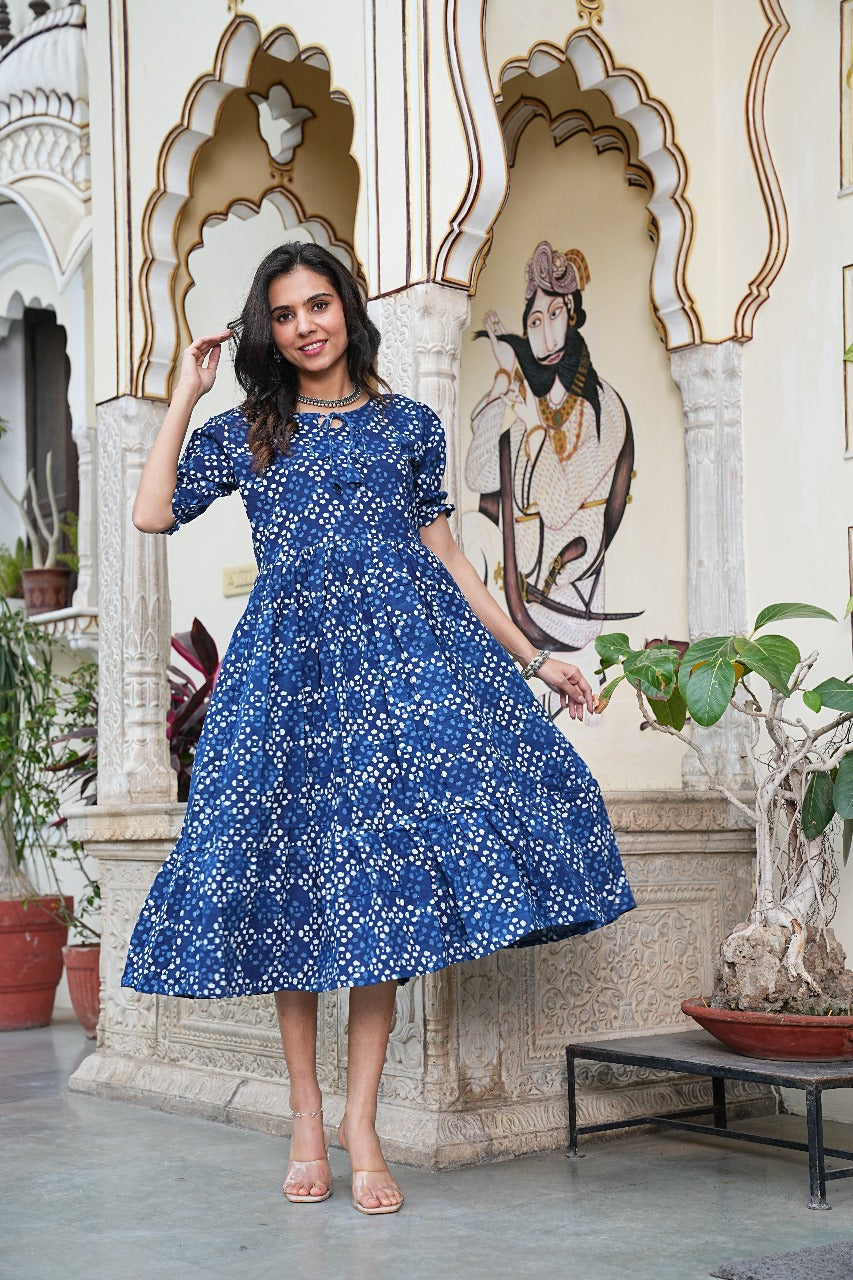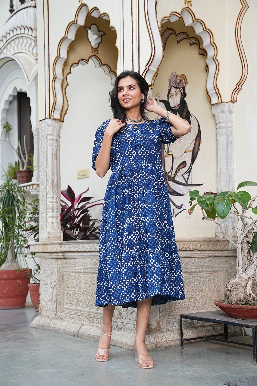 Timeless elegance meets playful charm in our INDIGO BLUE POLKA FLARED DRESS. Adorned with delicate polka-inspired floral motifs, this handcrafted piece is your go-to for effortless grace with a hint of fun.