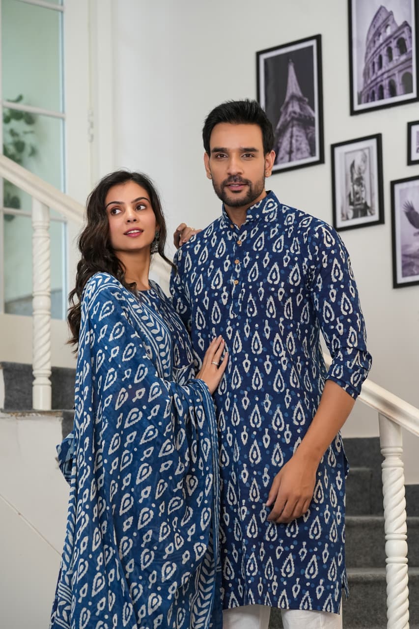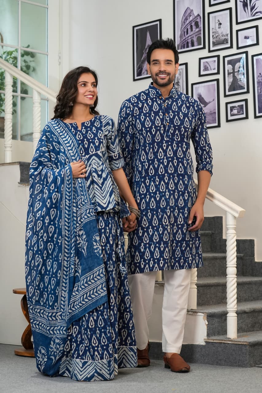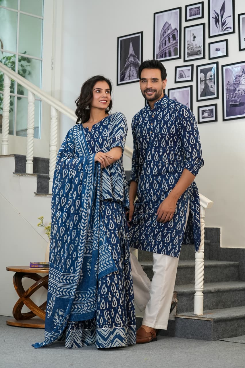 Bring alive the timeless beauty of handblock prints with this Indigo Charm - Natural Dabu Printed Couple Set – a perfect blend of heritage artistry & modern elegance. Designed in soft breathable cotton, this coordinated look is ideal for festive gatherings, family celebrations & couple twinning moments.