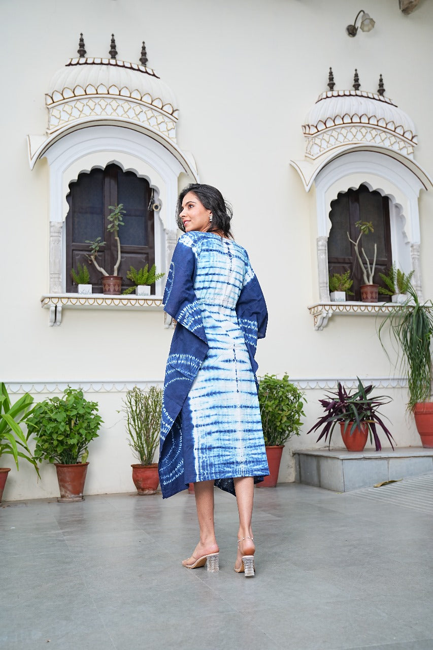 Breathe in the calm of coastal skies and serene oceans with our Indigo Dream Tie-Dye Kaftan. This breezy statement piece features a shibori-inspired tie-dye pattern in hues of navy and ice blue, evoking a handcrafted, artisanal vibe.