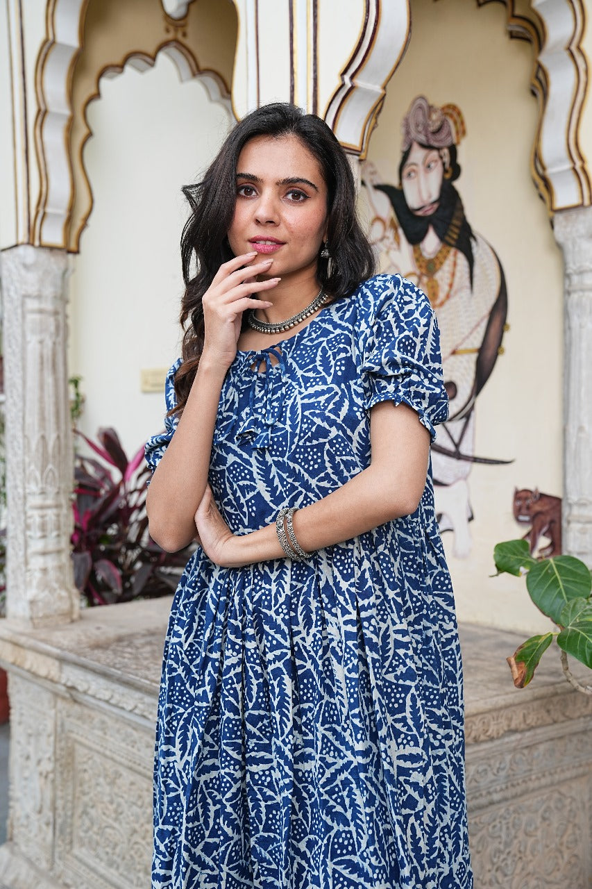 Step into timeless elegance with our INDIGO LEAF FLARED DRESS, crafted from breathable cotton and adorned with intricate white handblock motifs. This dress radiates effortless grace with a touch of boho charm.