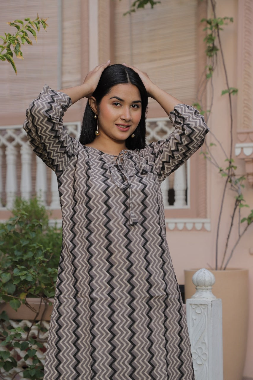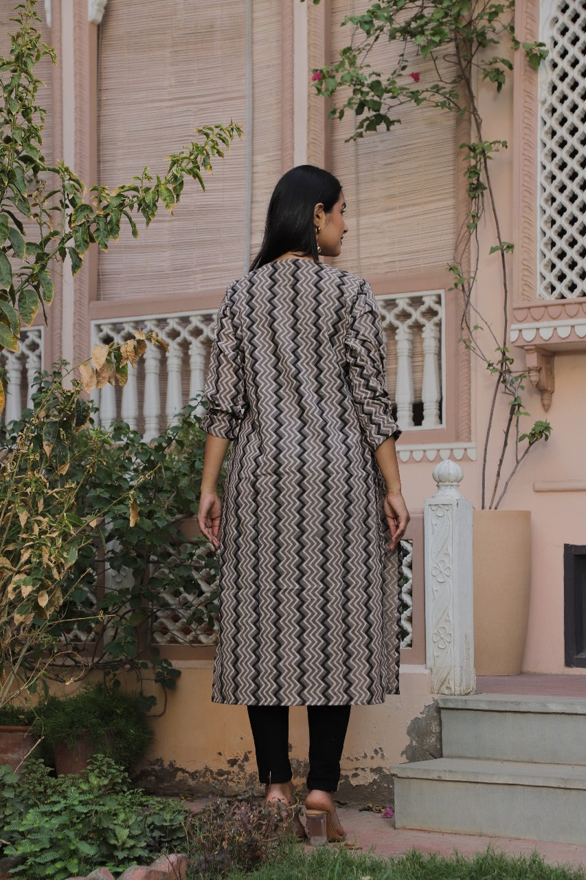 Add a dash of contemporary flair to your ethnic wardrobe with our Kashish block printed Straight Kurti. This elegant kurta features a soft blend of muted beige and black tones in a bold zig-zag pattern that’s both modern and timeless. Crafted in a breathable fabric, it offers all-day comfort without compromising on style.