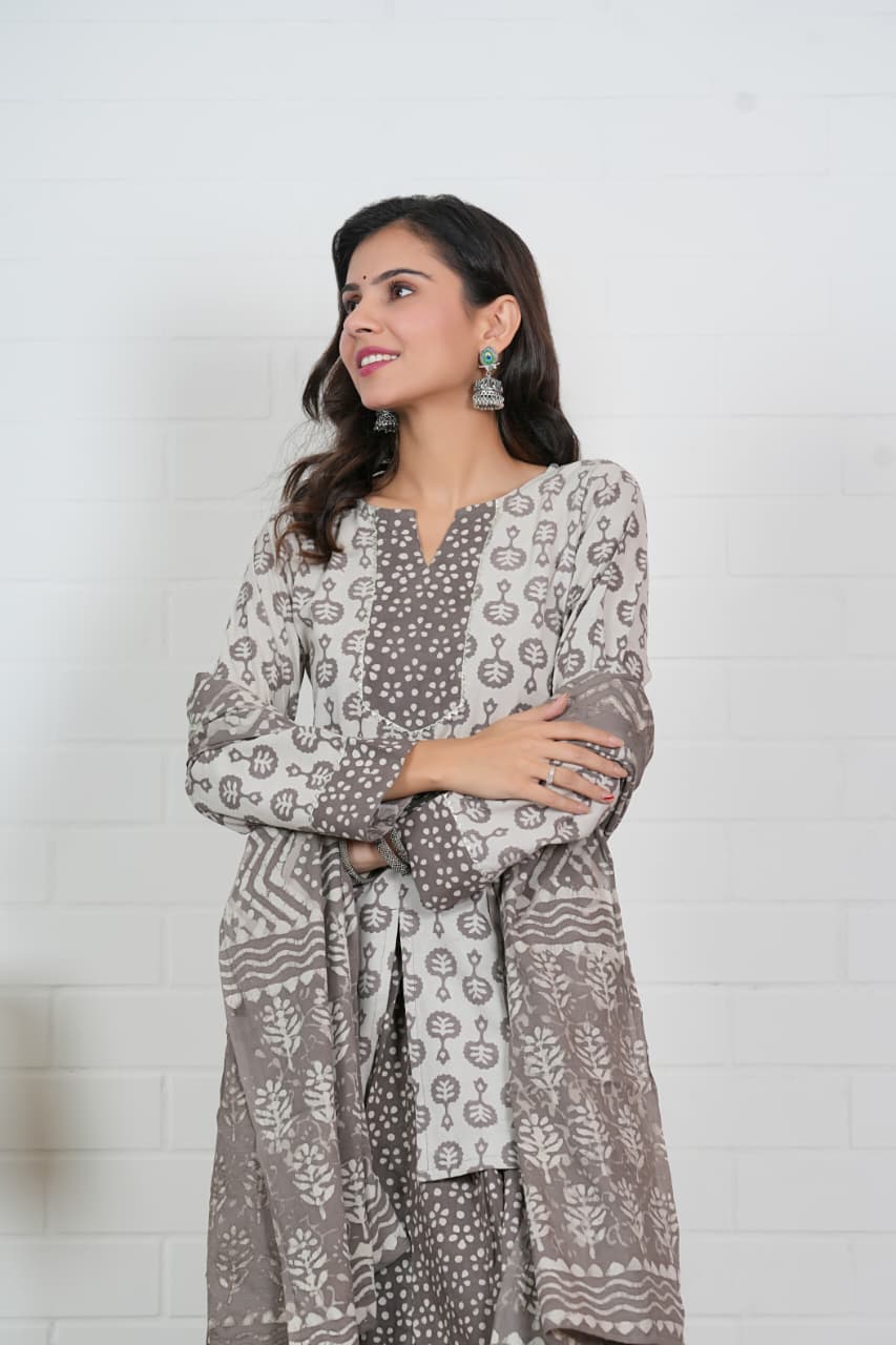 Dupatta: Matching grey hand block printed with bold chevron and floral designs