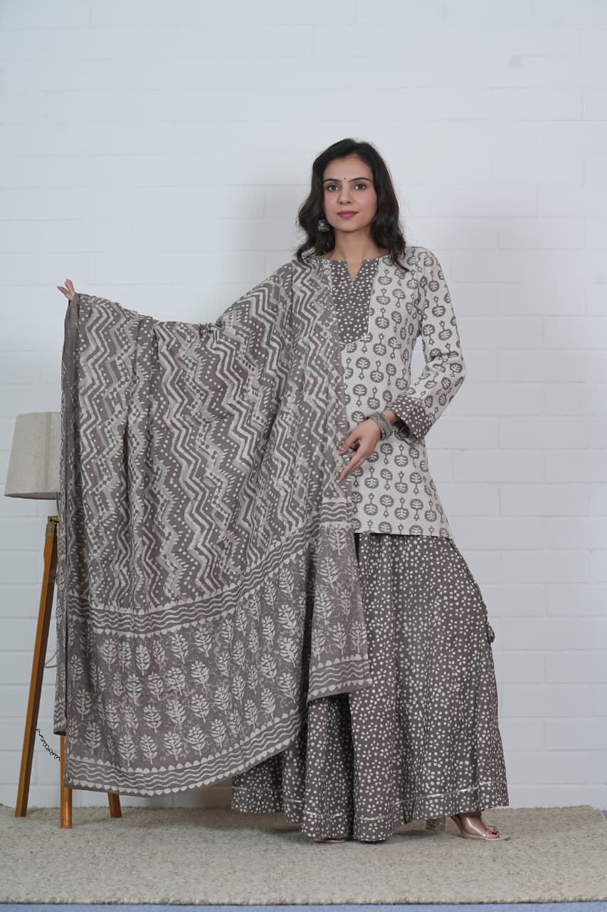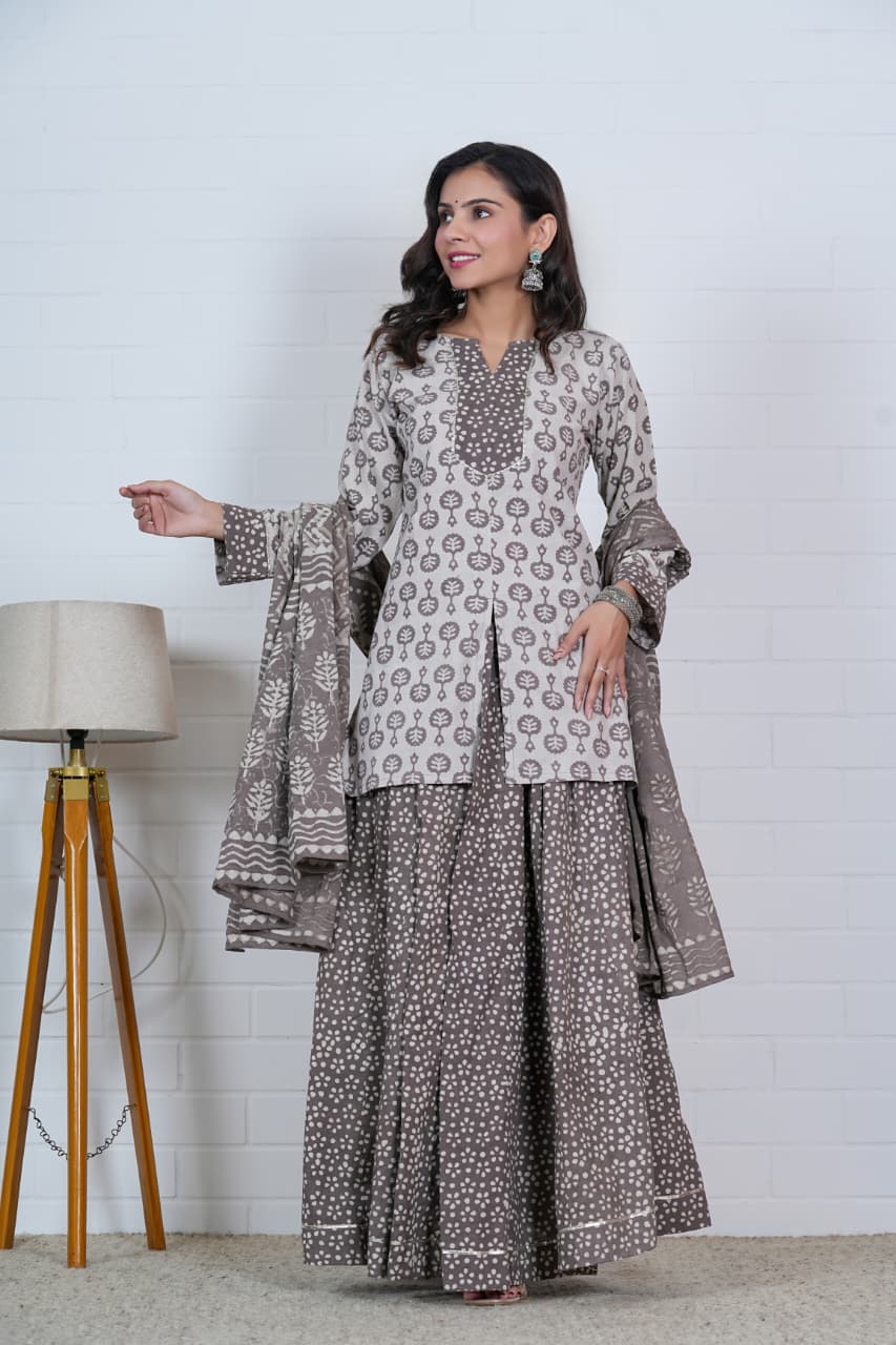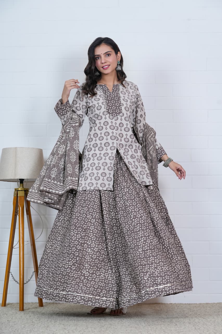 Lehenga & Kurta Top: Grey base with ivory block prints in floral and abstract motifs