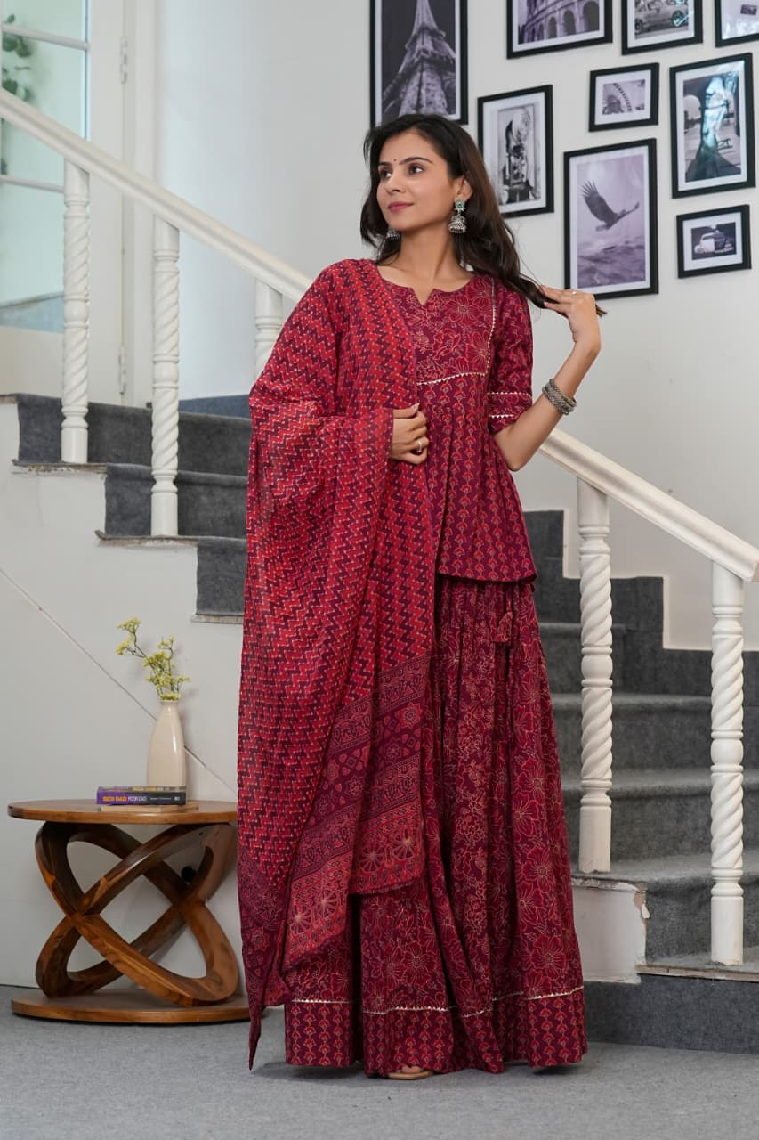 Drenched in the richness of deep reds, the Kumudini - Deep Maroon Handblock Lehenga Set is an ode to timeless traditions. With its peplum-style kurti, flowy lehenga, and matching dupatta, this ensemble blends elegance with comfort, making it your perfect festive pick.