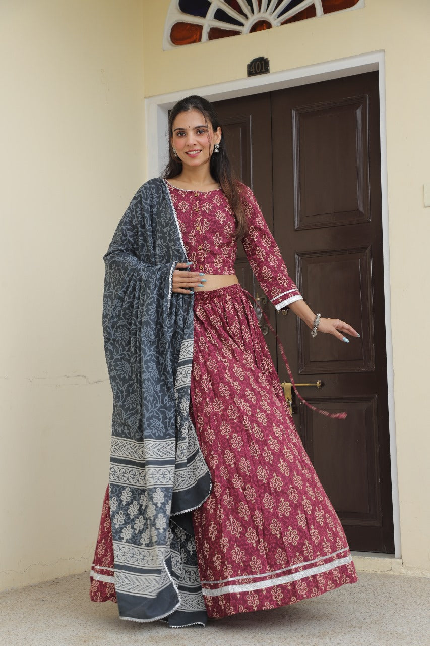 Step into timeless grace with our Maroon Handblock Printed Lehanga set, a perfect blend of traditional craftsmanship and contemporary elegance. Designed for the modern woman who values culture and comfort, this ensemble is ideal for festive occasions, family gatherings, or casual ethnic wear.