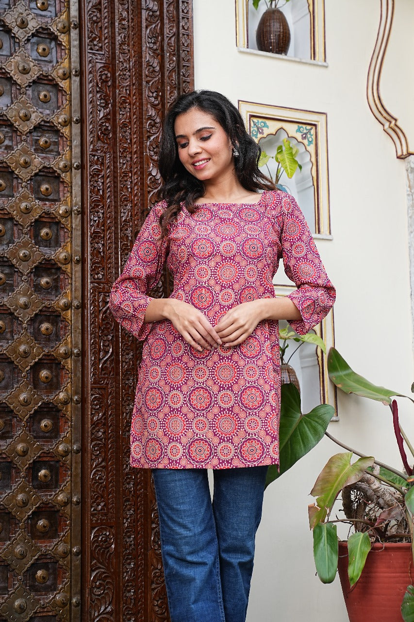 Bring a splash of color to your wardrobe with our Vibrant Pink Mandala Print Cotton Kurti, designed for women who love bold, artistic flair with unmatched comfort. Featuring intricate mandala patterns in shades of pink, orange, and blue, this kurti is a celebration of Indian heritage and contemporary styling.