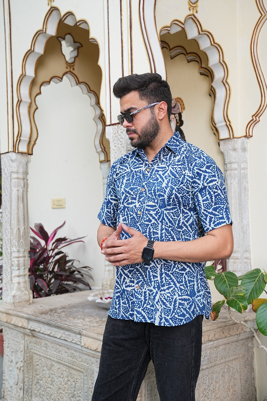 Step into style with our Indigo Leaf Print Cotton Shirt, a perfect fusion of traditional aesthetics and modern tailoring. Inspired by nature and handcrafted to perfection, this shirt offers an effortlessly cool look that works from brunches to beach getaways.