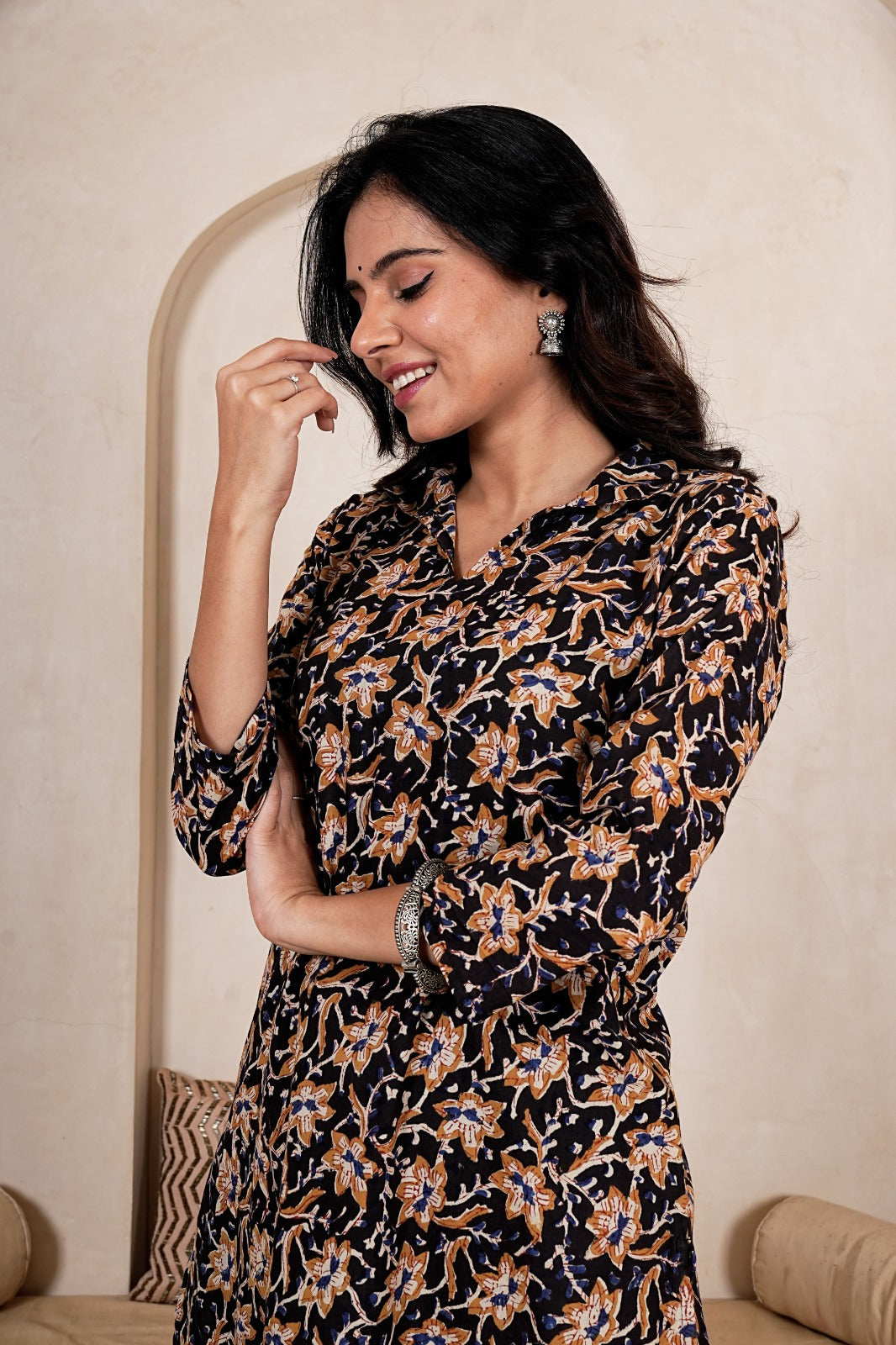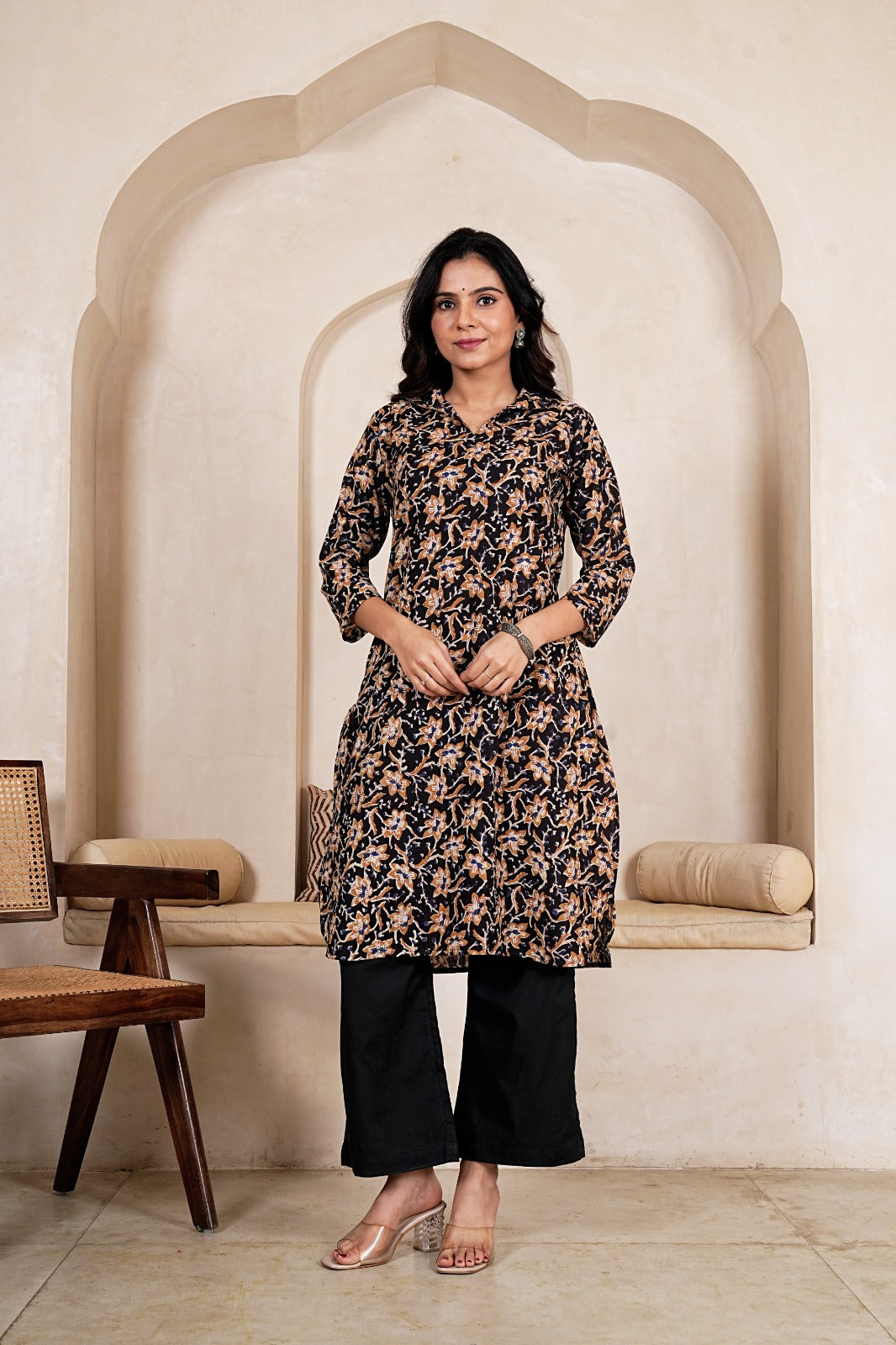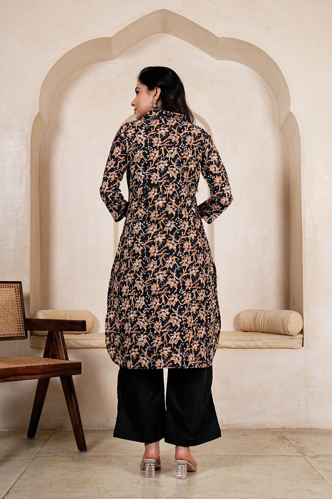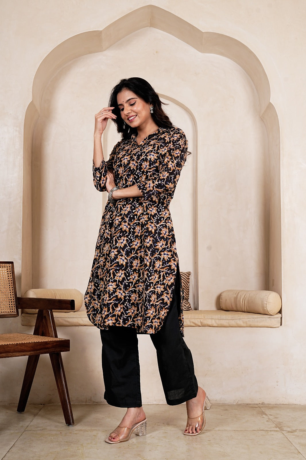 Elevate your everyday style with the Midnight Floral Straight Kurta Set, a timeless fusion of earthy tones and delicate artistry. Set against a deep midnight base, the kurta features intricate floral motifs in warm mustard and beige hues, creating a rich and elegant contrast. Paired with solid black bottoms, this ensemble offers a refined yet effortless look—perfect for both casual outings and subtle festive moments.