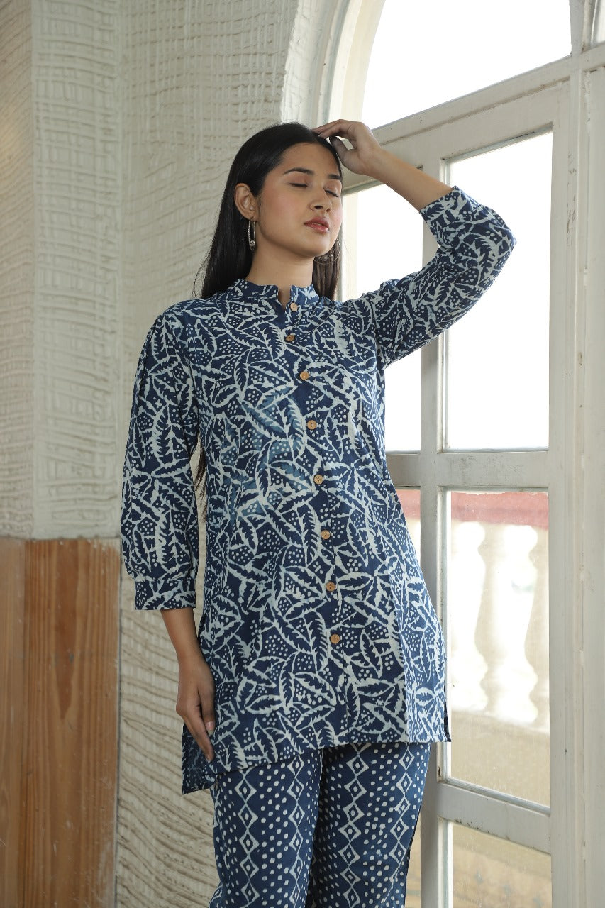 Channel timeless elegance with a touch of modern flair in our Indigo Leaf & Diamond Print Co-Ord Set. Designed to be both stylish and functional, this chic ensemble effortlessly blends a nature-inspired leaf pattern on the top with a contrasting geometric diamond design on the pants, creating a visually striking yet harmonious look.