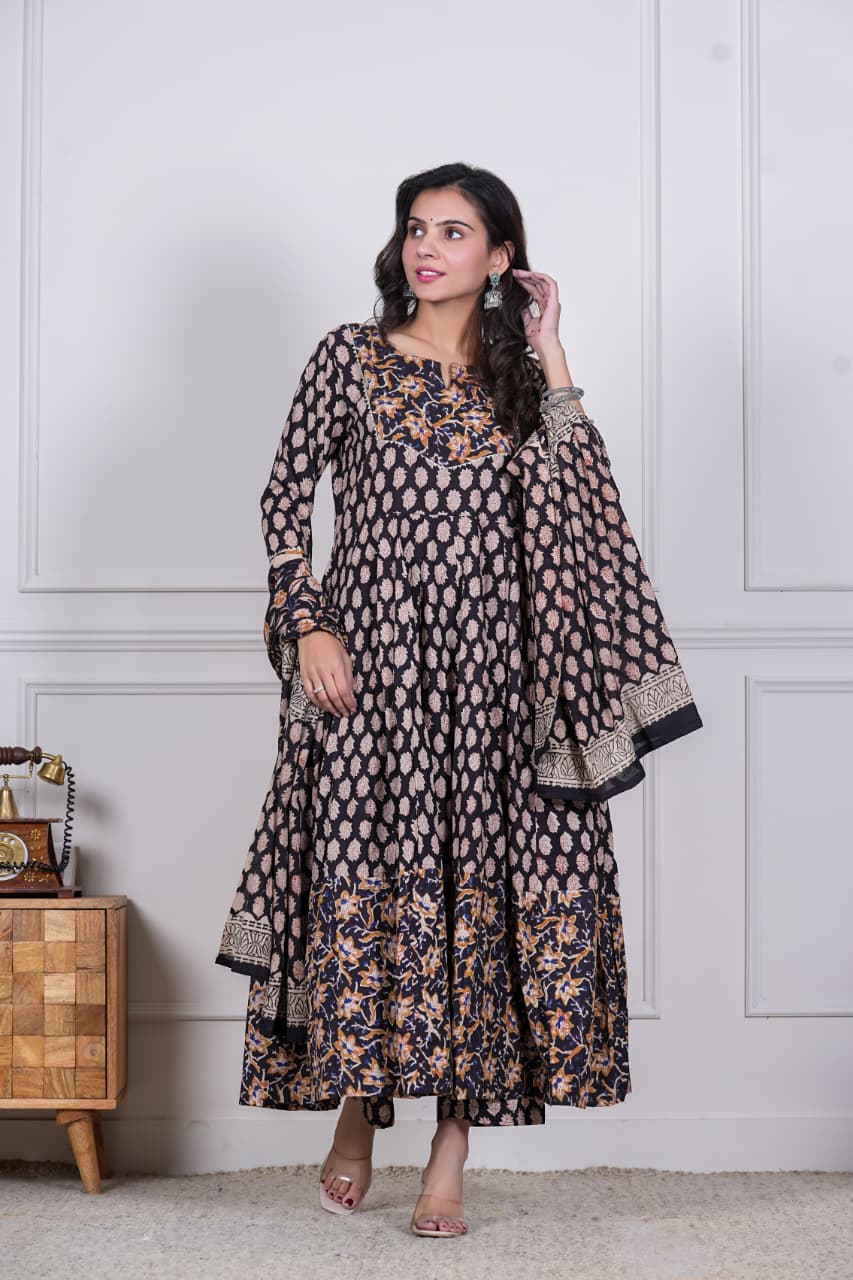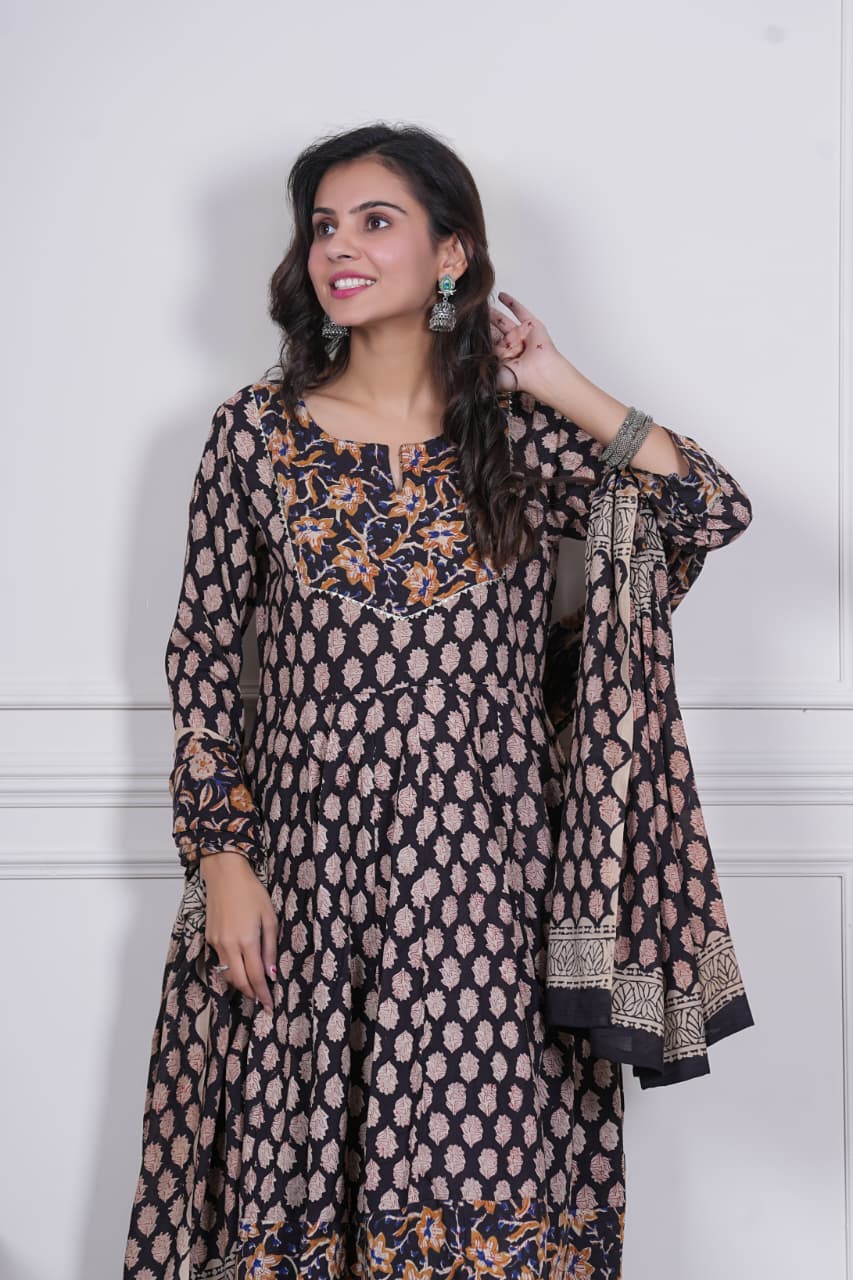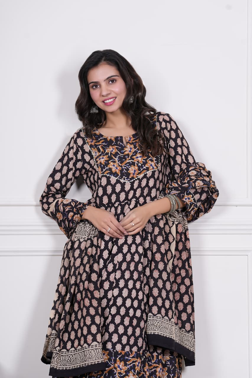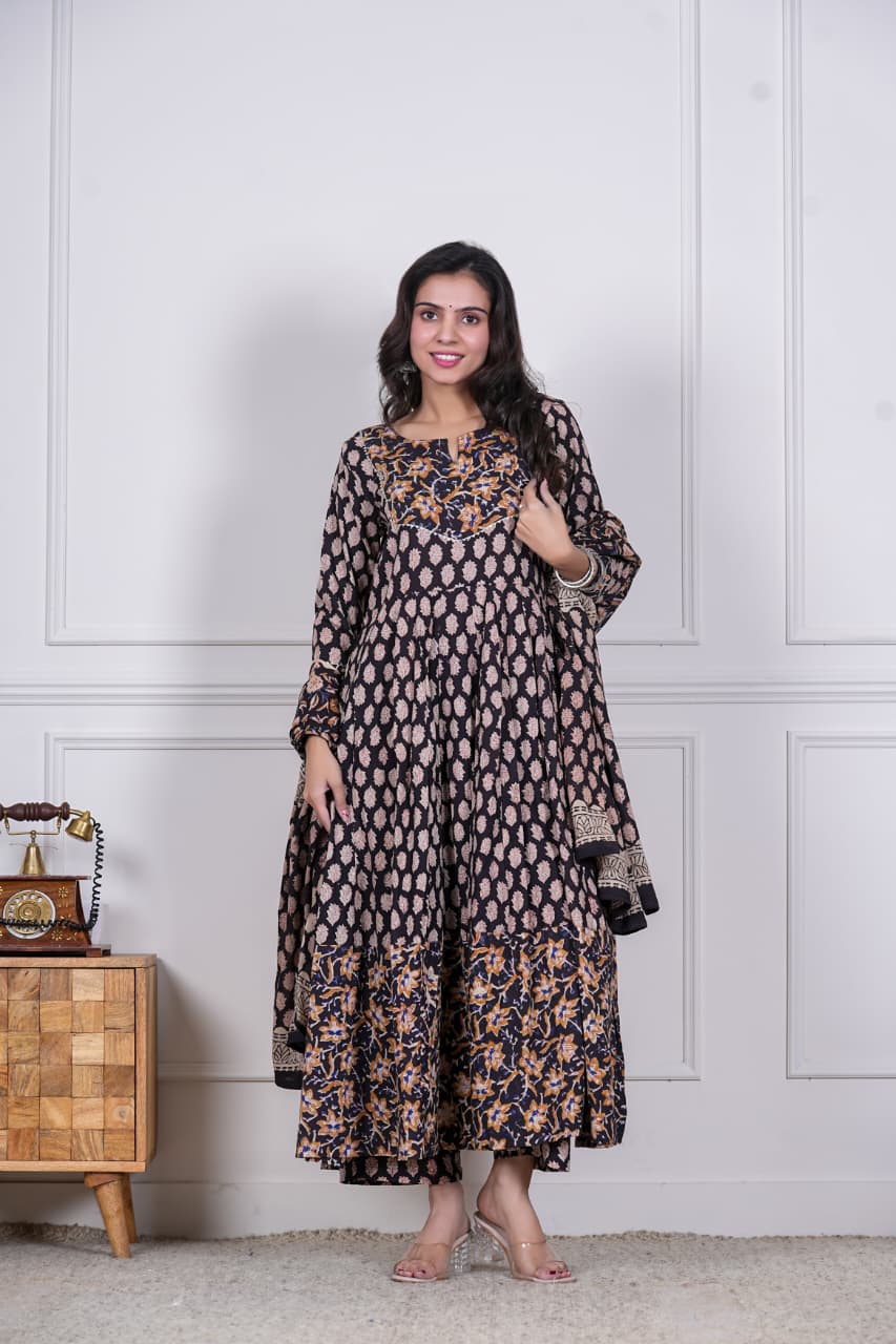 Grace meets tradition with Nayra, a stunning hand block printed Anarkali set that speaks of timeless artistry. Designed in midnight black with delicate beige motifs and a contrasting floral hemline in rust & mustard hues, this ensemble is perfect for elegant festive dressing.