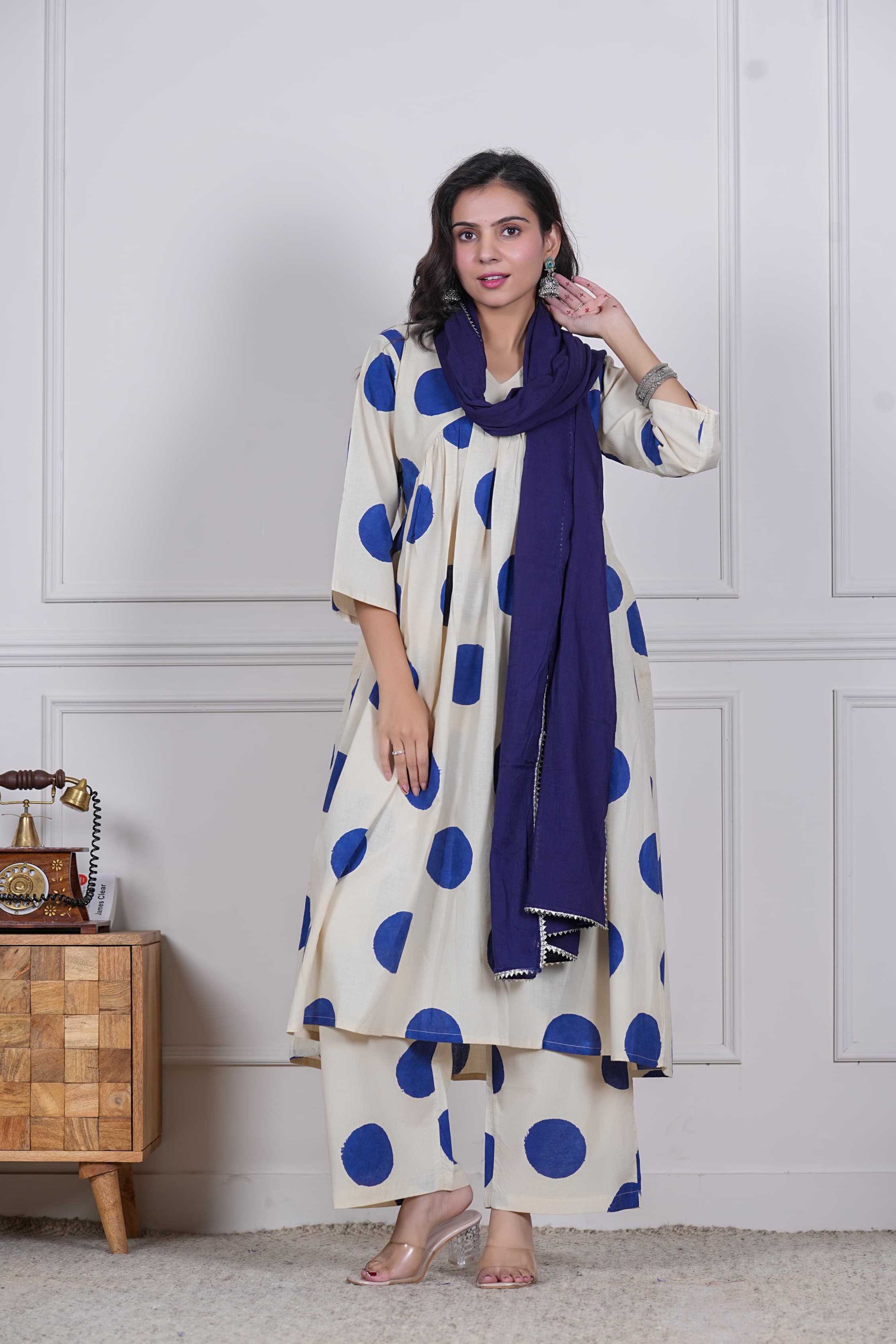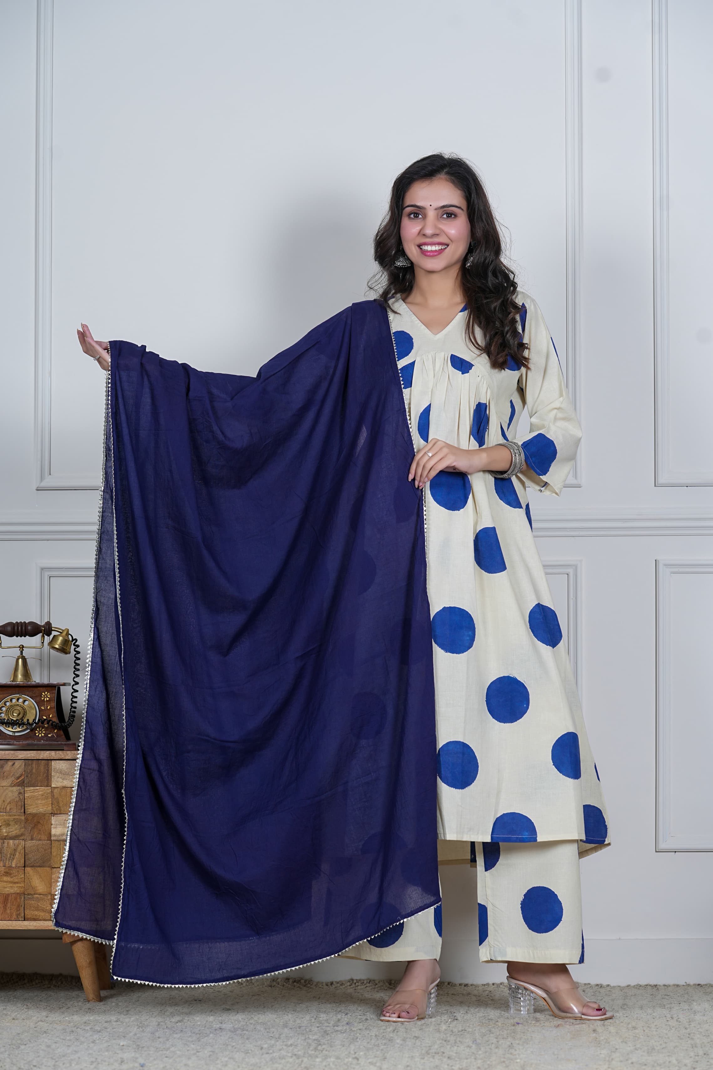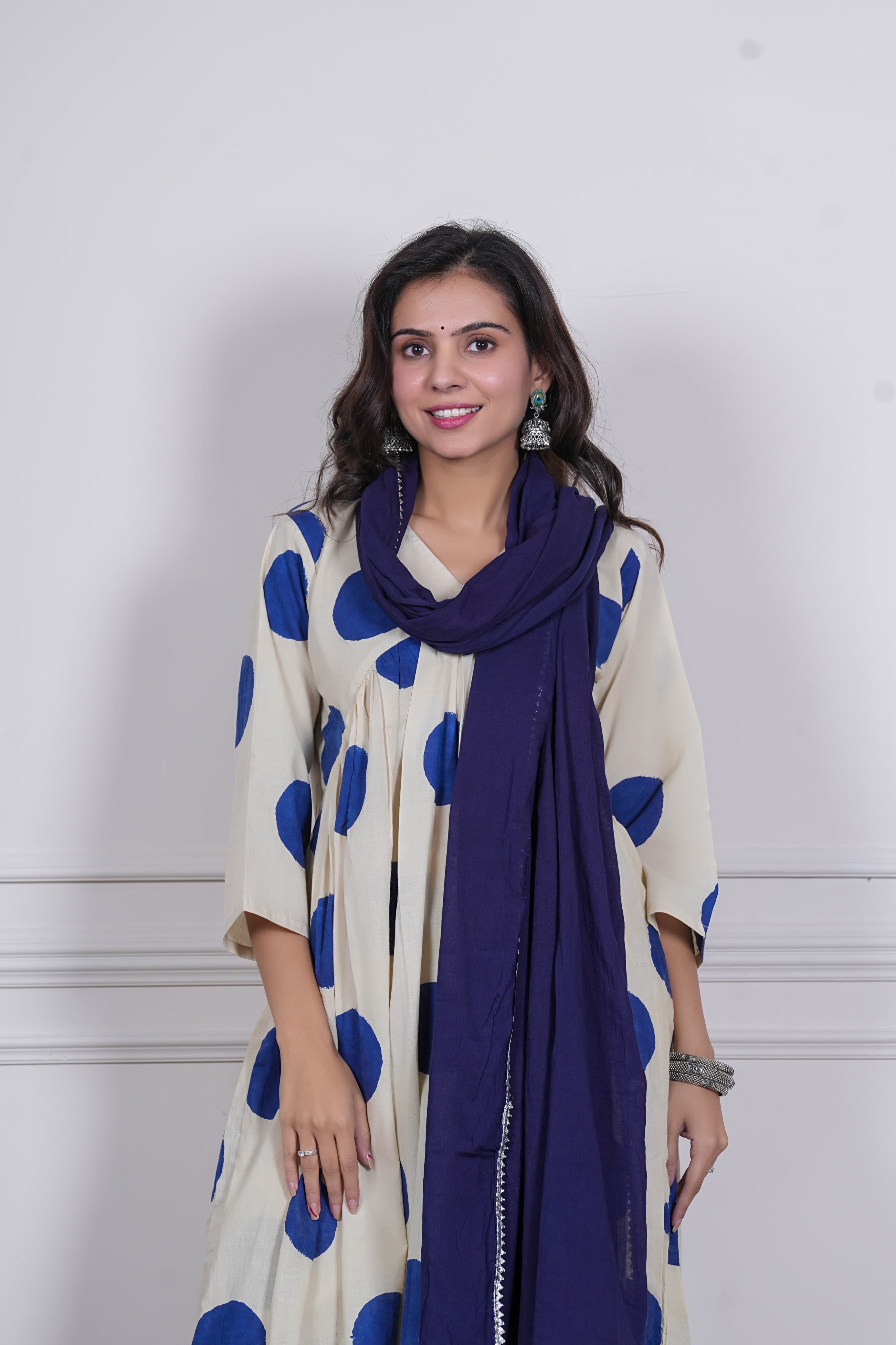 Playful meets poised in Neel Bindu, a handcrafted cotton 3-piece set that brings modern minimalism to traditional design. The kurta and pants feature bold indigo blue polka dots hand block printed on a soft natural off-white base, radiating youthful elegance. A contrast deep navy dupatta, finished with delicate lace edging, ties the look together with grace.