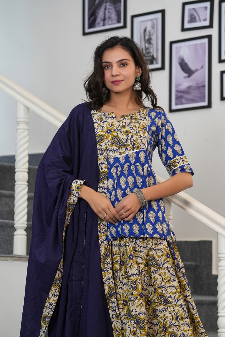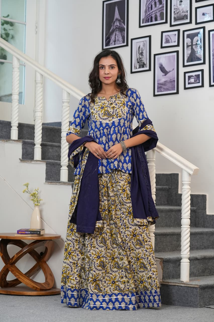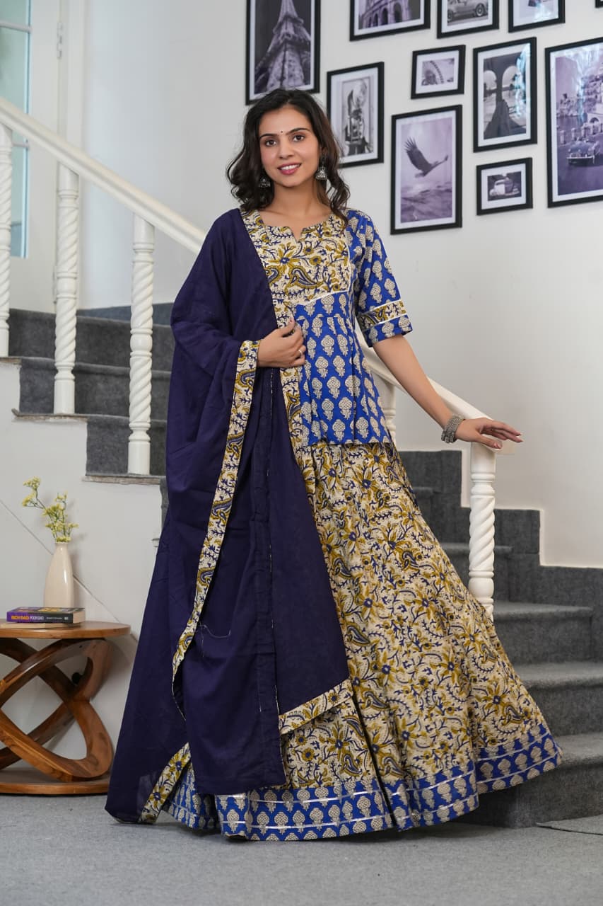 Immerse yourself in the beauty of handcrafted tradition with this Neel Kanika Handblock Printed Lehenga Set. Adorned with intricate floral motifs in hues of royal indigo, mustard yellow, and natural cream, this ensemble is a true celebration of artisanal elegance.
