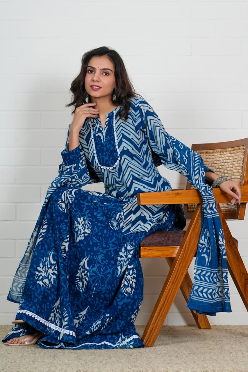Dupatta: Matching indigo printed dupatta with soft block accents