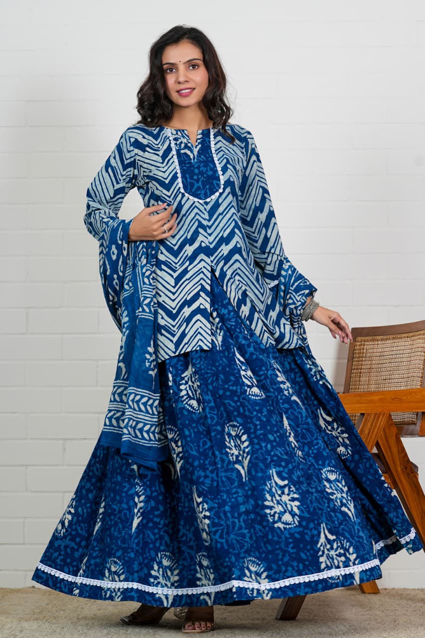 Drape yourself in the serene charm of indigo with Neelaya, a handcrafted hand block printed lehenga set that beautifully blends tradition with modern elegance. Its soothing shades of blue and white create a graceful ethnic look, perfect for festive celebrations or cultural gatherings.