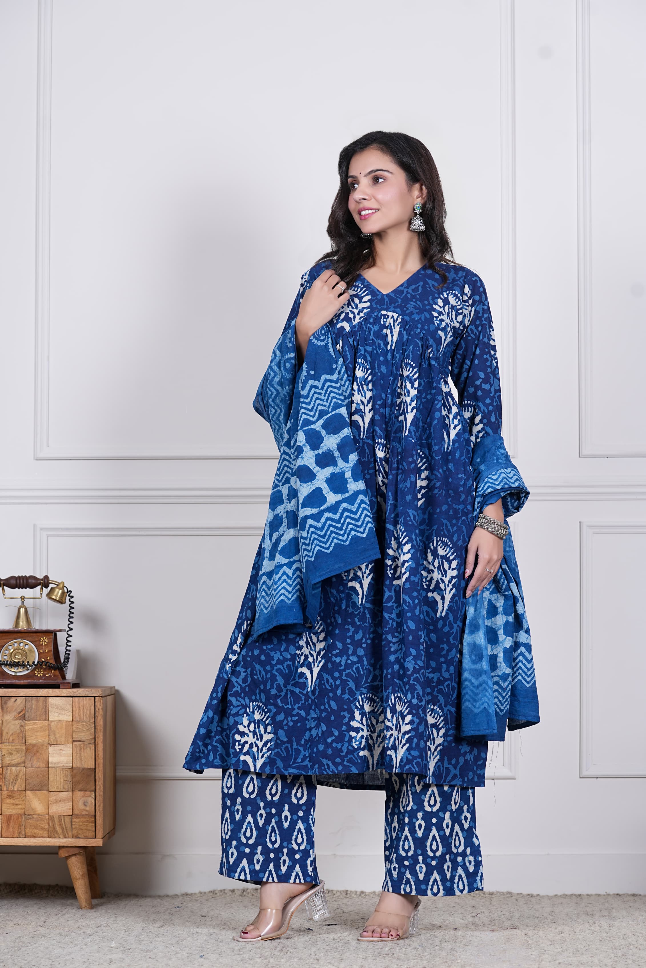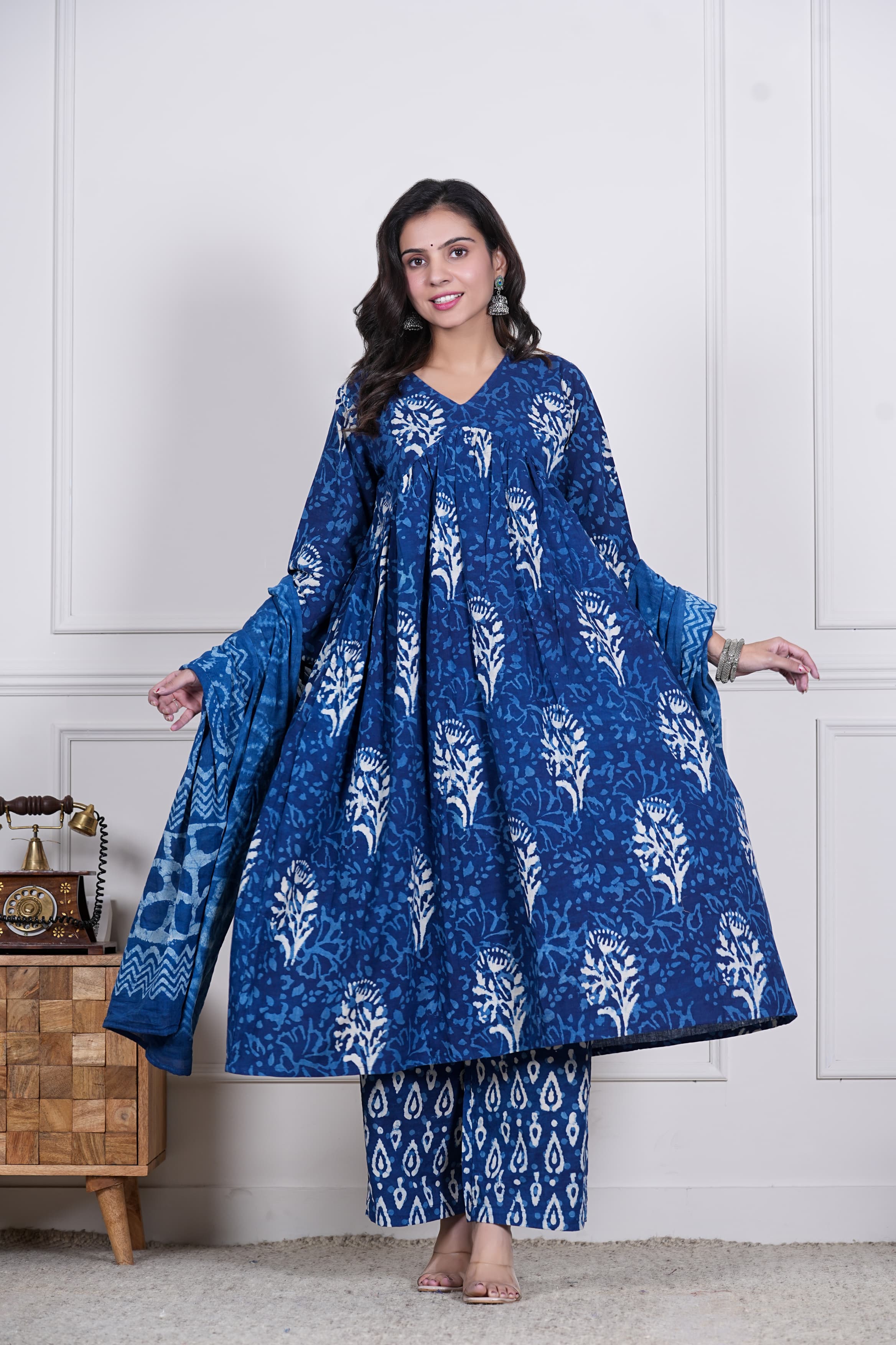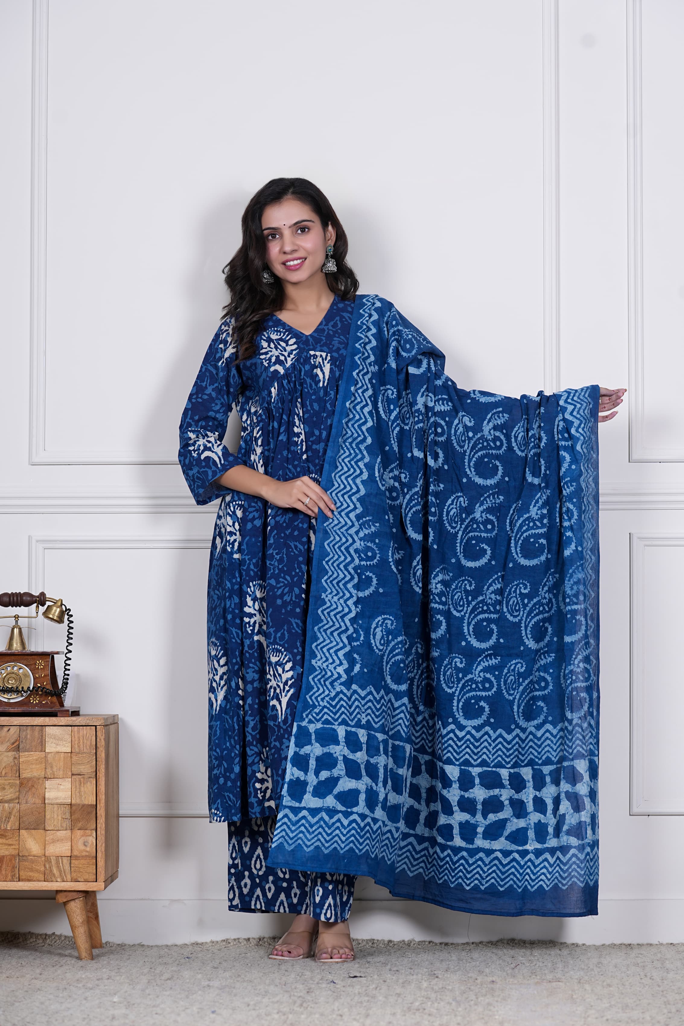 Dive into the elegance of handcrafted heritage with our Neelika set – an ode to the timeless charm of indigo. The kurta, blooming with nature-inspired block prints in ivory over deep blue, features soft pleating and a flattering V-neckline. It pairs seamlessly with printed straight pants and a lightweight mul cotton dupatta, featuring abstract patterns, paisley motifs, and chevron borders — creating a serene harmony in shades of blue.