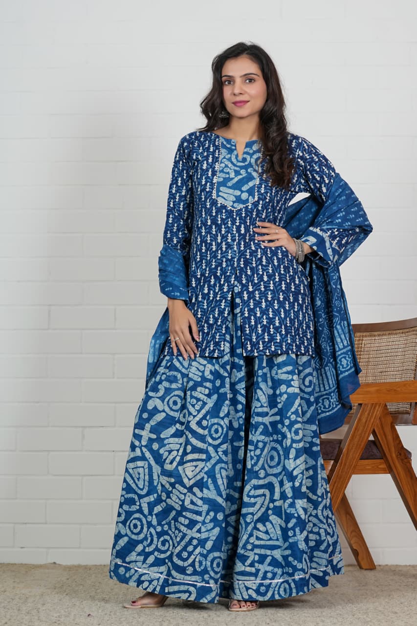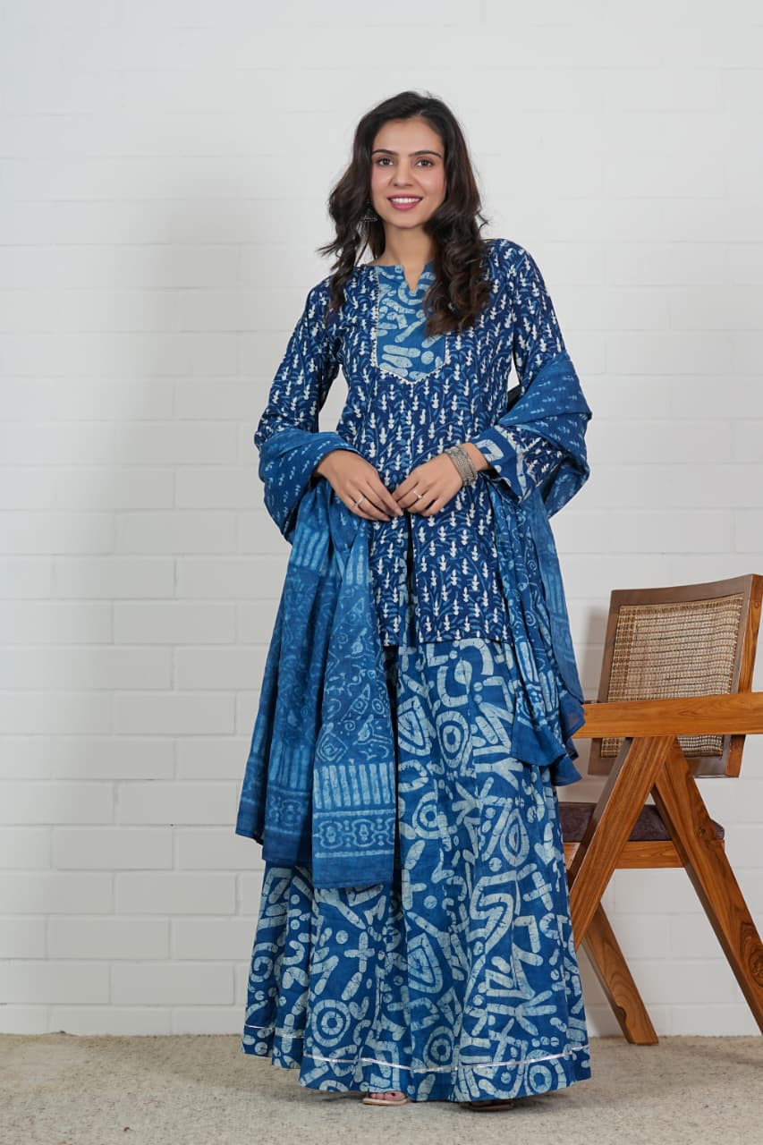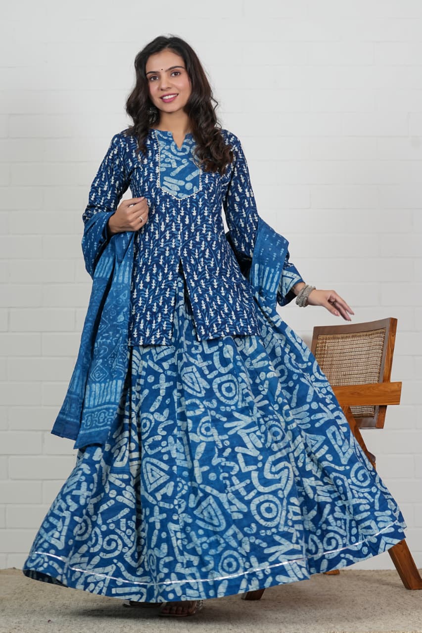 Lehenga & Kurta Top: Indigo blue with white hand block prints