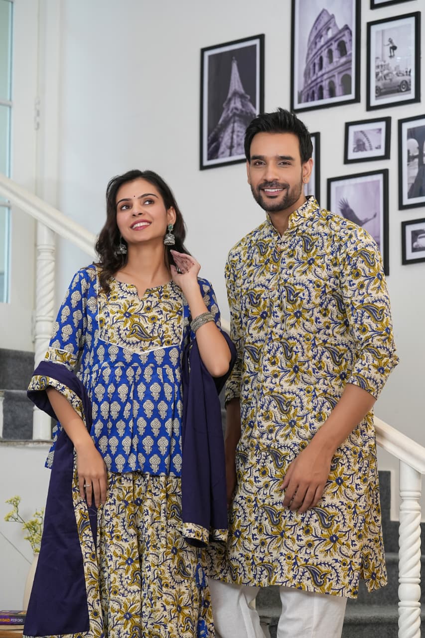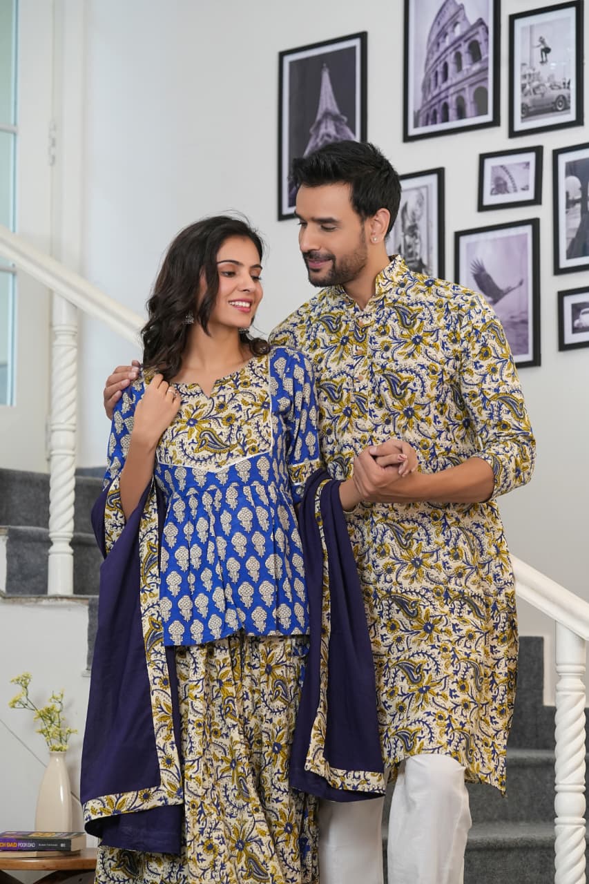Celebrate love & tradition in style with the NeelKanth Handblock Couple Set. Crafted in premium breathable cotton, this vibrant duo features royal blue & mustard floral motifs, bringing heritage artistry alive with a modern silhouette.