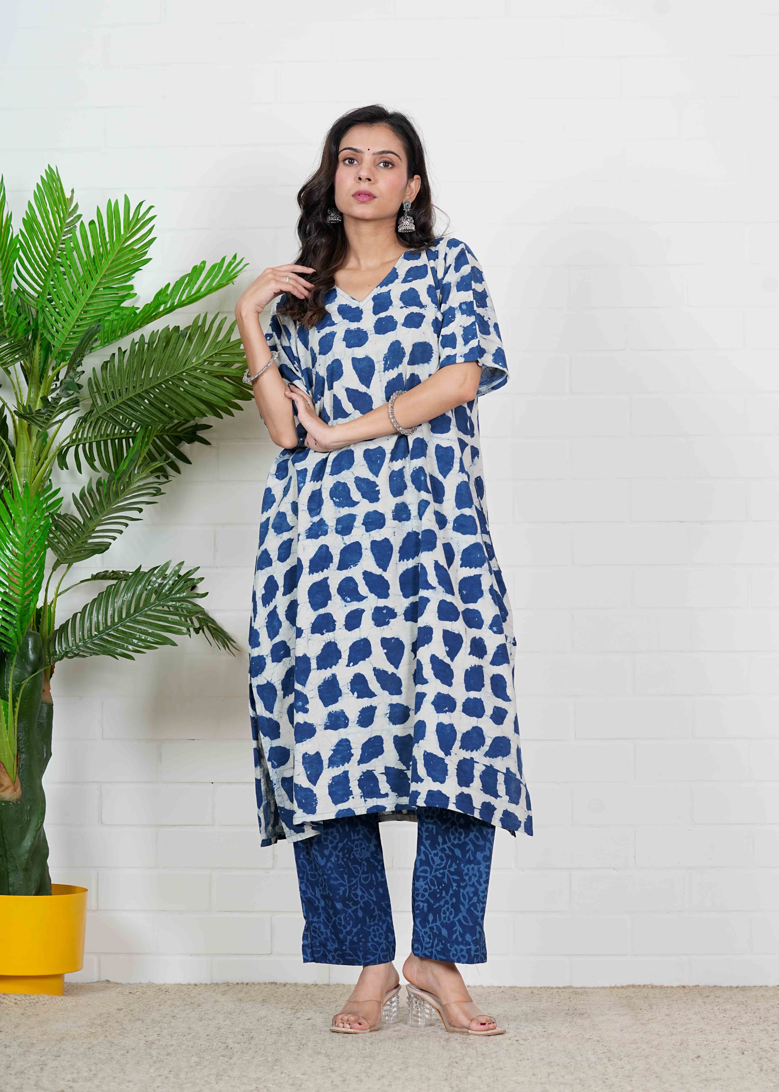 Make a splash in NeelPatakha, where tradition meets modern artistry. This oversized kurti features a captivating hand block abstract print in deep indigo hues on a soft off-white base, giving it an expressive, contemporary vibe. Paired with darker indigo printed pants for a beautiful contrast, this co-ord set is perfect for everyday elegance with a hint of drama.