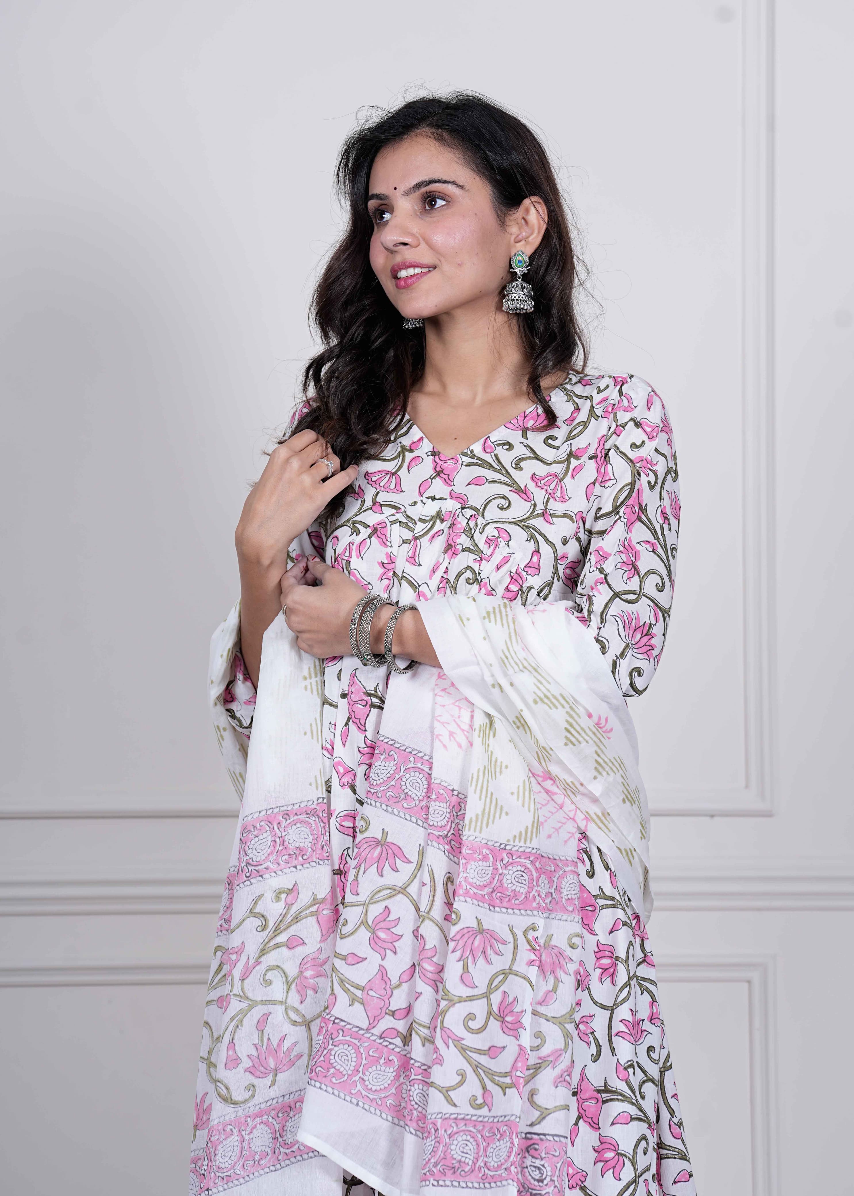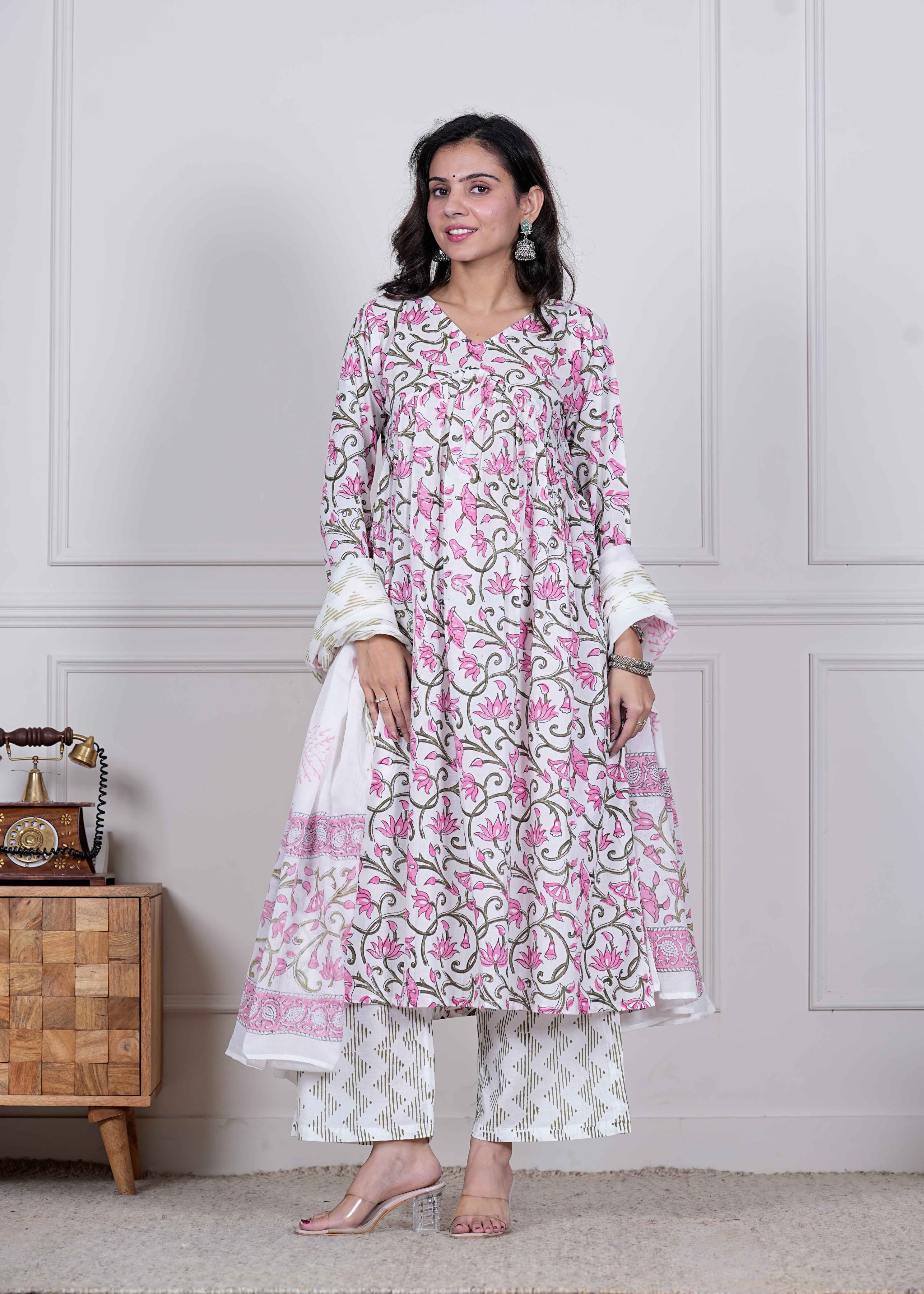 Step into elegance with Phoolkari Bageecha, a graceful 3-piece hand block printed cotton set that whispers the romance of blooming gardens. The kurta features delicate pink floral vines printed on a soft off-white base, beautifully paired with printed trousers and a statement white cotton dupatta adorned with coordinating floral and chevron block prints in pink and olive green.