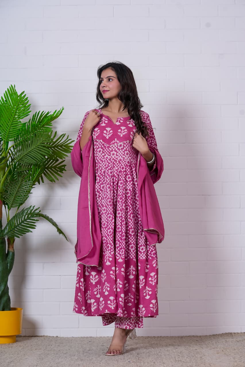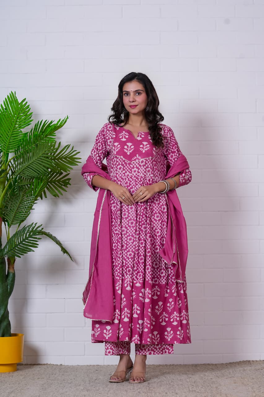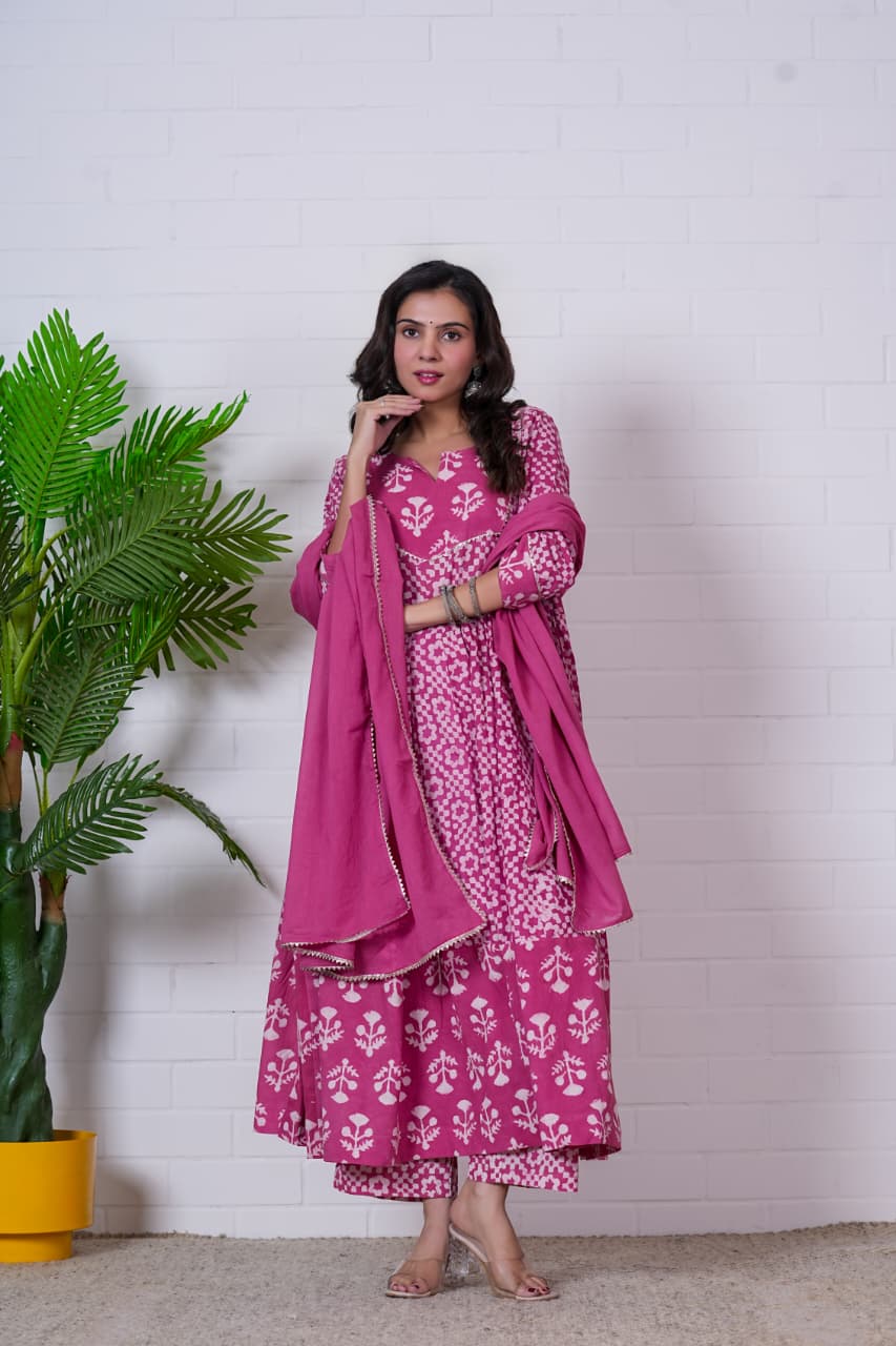 Add a splash of festive elegance with Gulbahaar, a graceful hand block printed cotton Anarkali set in a radiant shade of Rani Pink. Adorned with intricate white floral and geometric motifs, this ensemble brings together tradition and comfort with effortless charm.