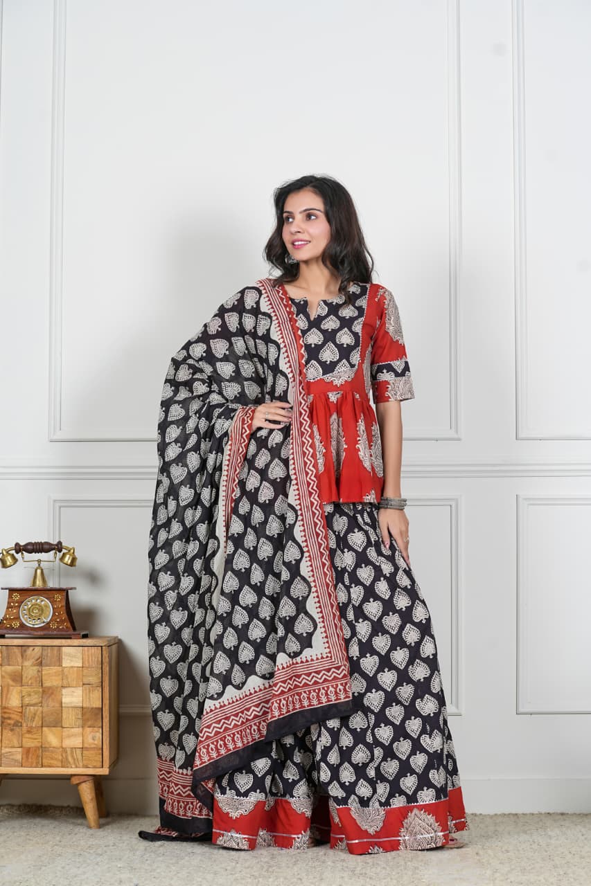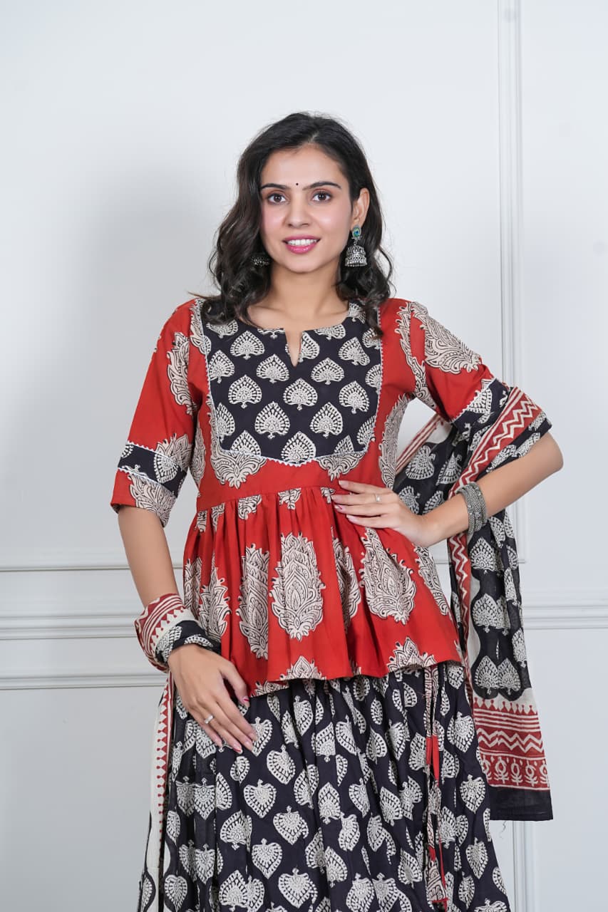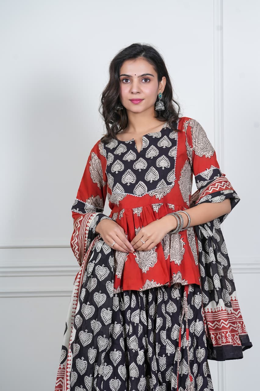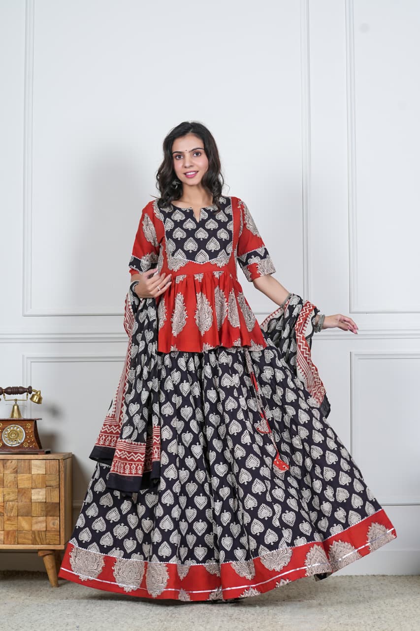 A perfect harmony of earthy hues and timeless artistry, this Rust & Cream Handblock Printed Lehenga Set is designed to make every occasion special. Handcrafted in India with pure cotton, it celebrates the elegance of tradition while adding a touch of modern grace.