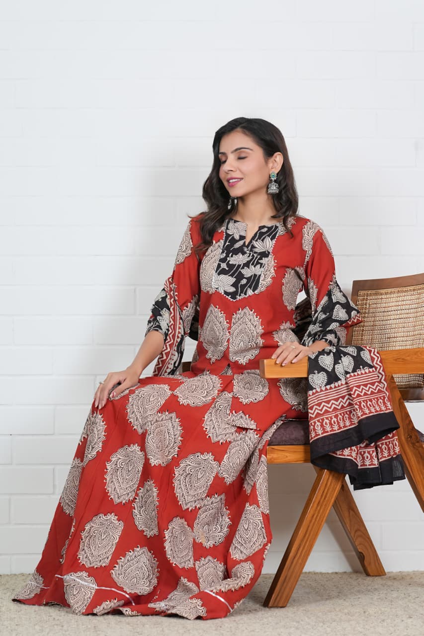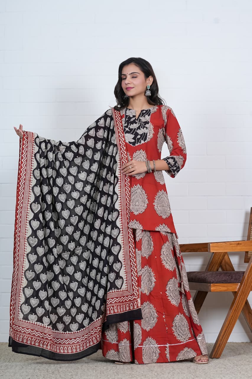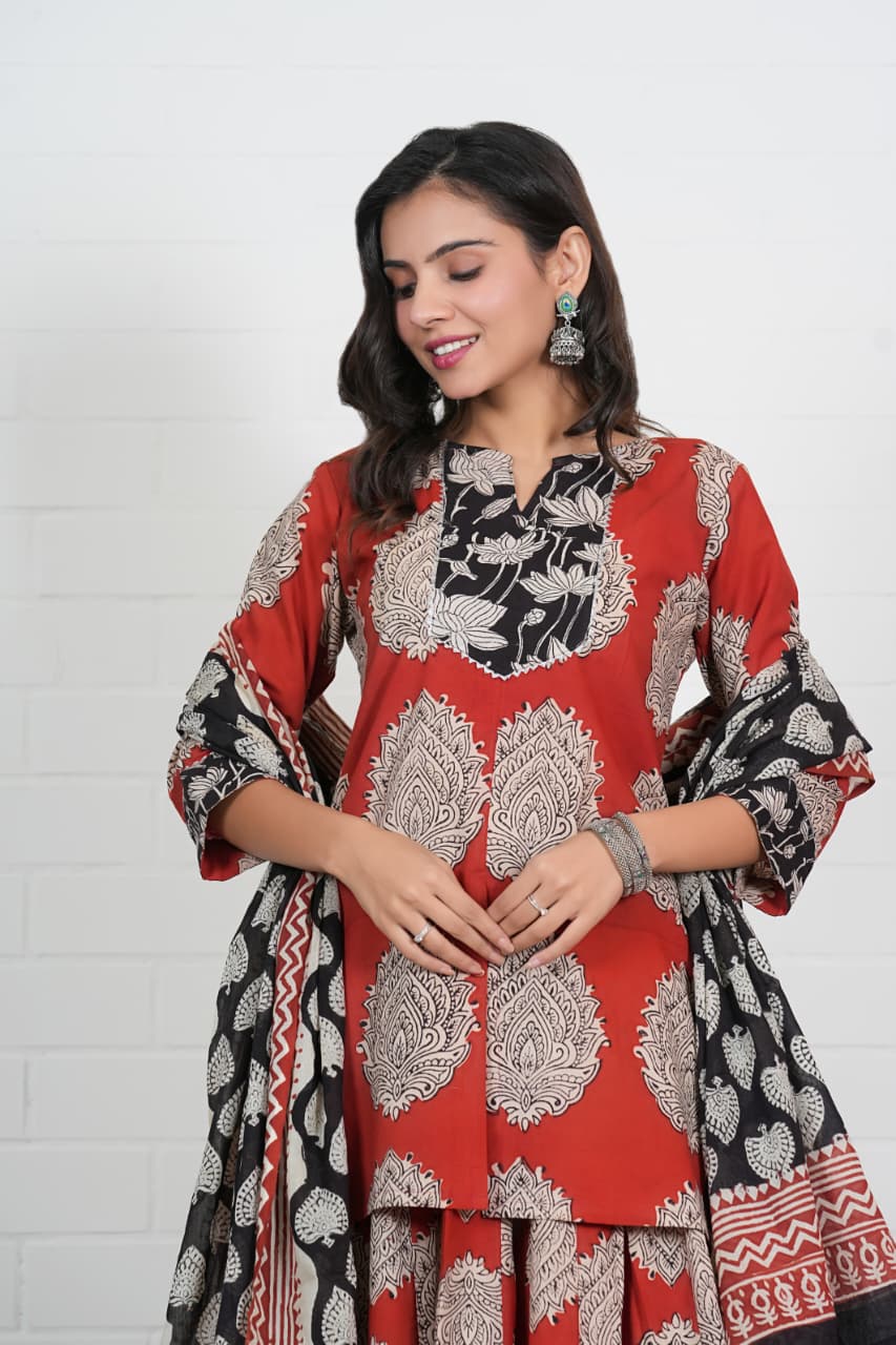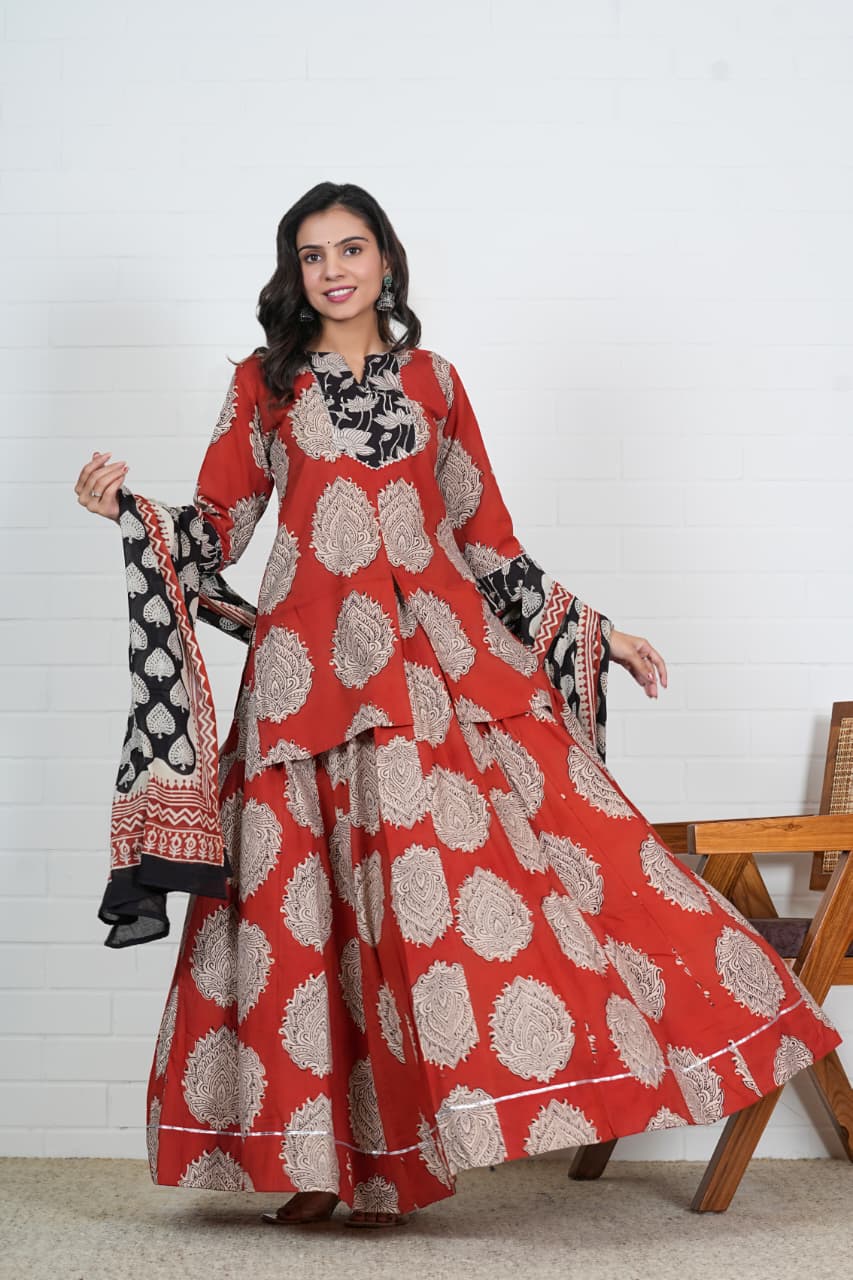 Infuse your wardrobe with a vibrant burst of color and tradition with this stunning Lehenga Set. The beautiful red kurta-style blouse features intricate block prints, paired perfectly with a flared lehenga skirt. The striking combination of red and black is highlighted with elegant beige block prints for a refined and chic look. The matching dupatta completes the ensemble with its elegant border, making it perfect for festive events, weddings, and celebrations.