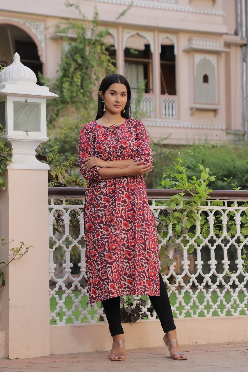 Add a splash of elegance and vibrance to your wardrobe with this Red Printed Straight Kurti, crafted to elevate your everyday style with ease. Featuring a stunning mix of ethnic motifs in bold red and white hues, this kurti perfectly balances tradition with contemporary flair.