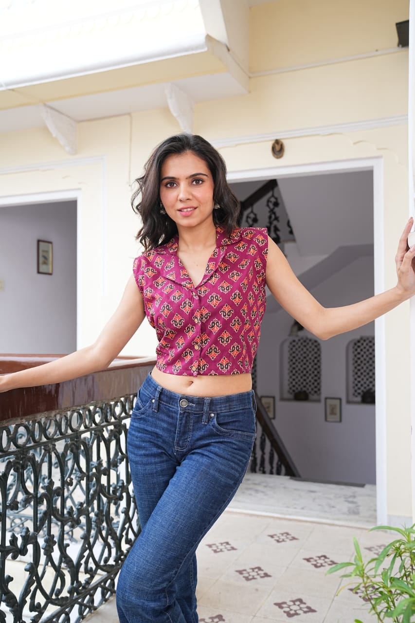 Bring home the vibrant spirit of Indian craft with our RICH MAROON crop top – a handcrafted piece that perfectly blends tradition with modern sass. Made from soft, breathable 100% cotton, this sleeveless crop top features a structured shirt collar and a flattering cropped length that adds effortless charm to your summer wardrobe.