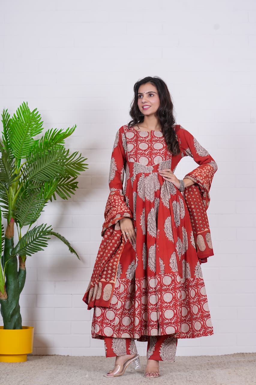 Celebrate timeless elegance with Ruhani, a handcrafted cotton Anarkali suit set that blends tradition with effortless grace. The warm rust red base, adorned with intricate white block-printed motifs and paisley-inspired detailing, makes it a perfect choice for festive gatherings or everyday elegance.