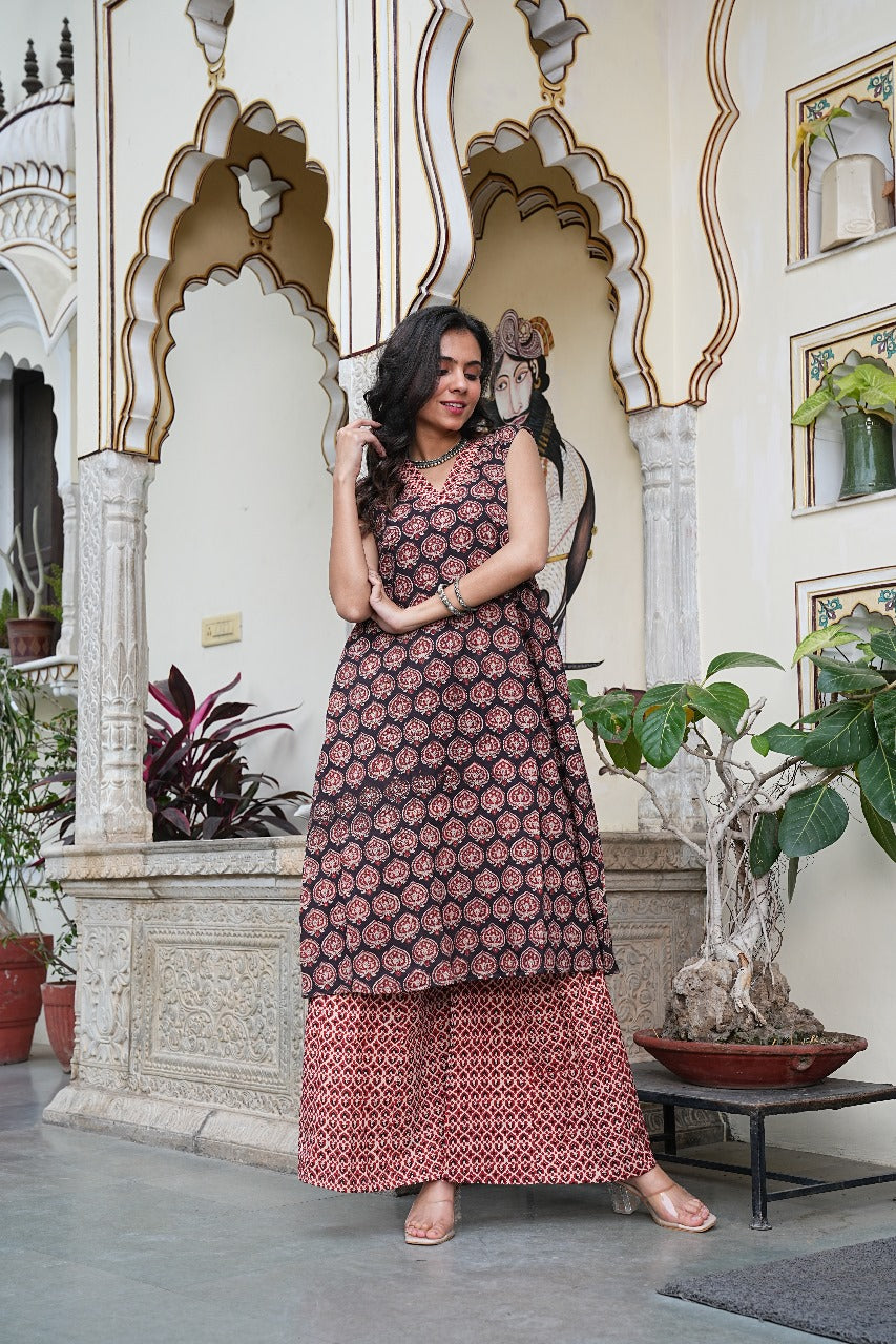 Elevate your ethnic wardrobe with this stunning Rust & Black Block Print Kurta Set, a beautiful combination of contemporary silhouette and timeless Indian craftsmanship. This sleeveless ensemble features a bold floral printed kurta paired with contrasting geometric palazzo pants – perfect for festive occasions, casual gatherings, or even elegant everyday wear.